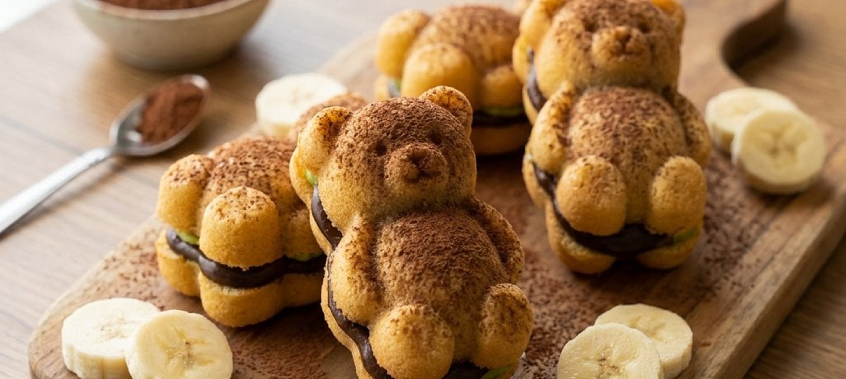 - 1În timp ce ursuleții se răcesc, pregătiți umplutura. Puneți banana decojită, miezul de avocado, mierea și restul de 20 g de cacao întrun robot de bucătărie și mixați până obțineți o cremă fină.