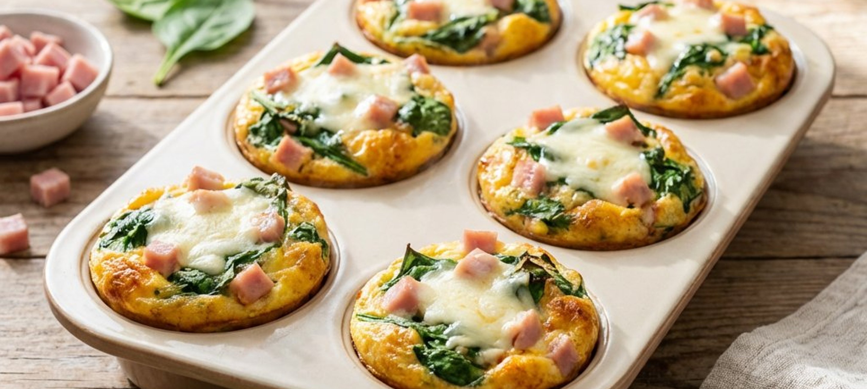 - 4Tăiați șunca de porc, mozzarella și spanacul baby în cubulețe mici și adăugați-le în bolul cu ouă și praz.