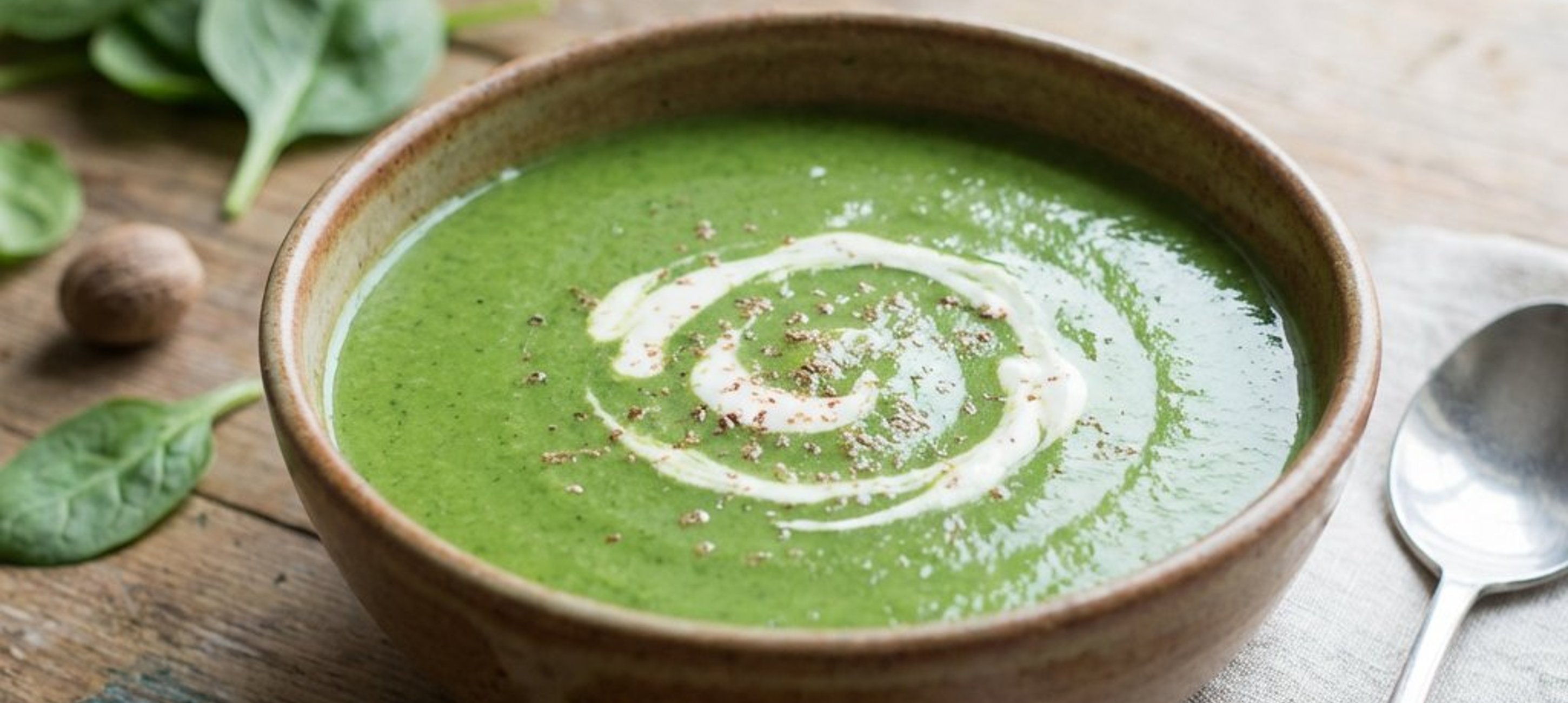 - 3Transferați compoziția într-un blender, adăugați spanacul baby proaspăt și mixați până obțineți o cremă fină și omogenă. Turnați smântâna pentru gătit și potriviți gustul cu piper și nucșoară măcinată. Serviți supa caldă, eventual cu crutoane crocante.