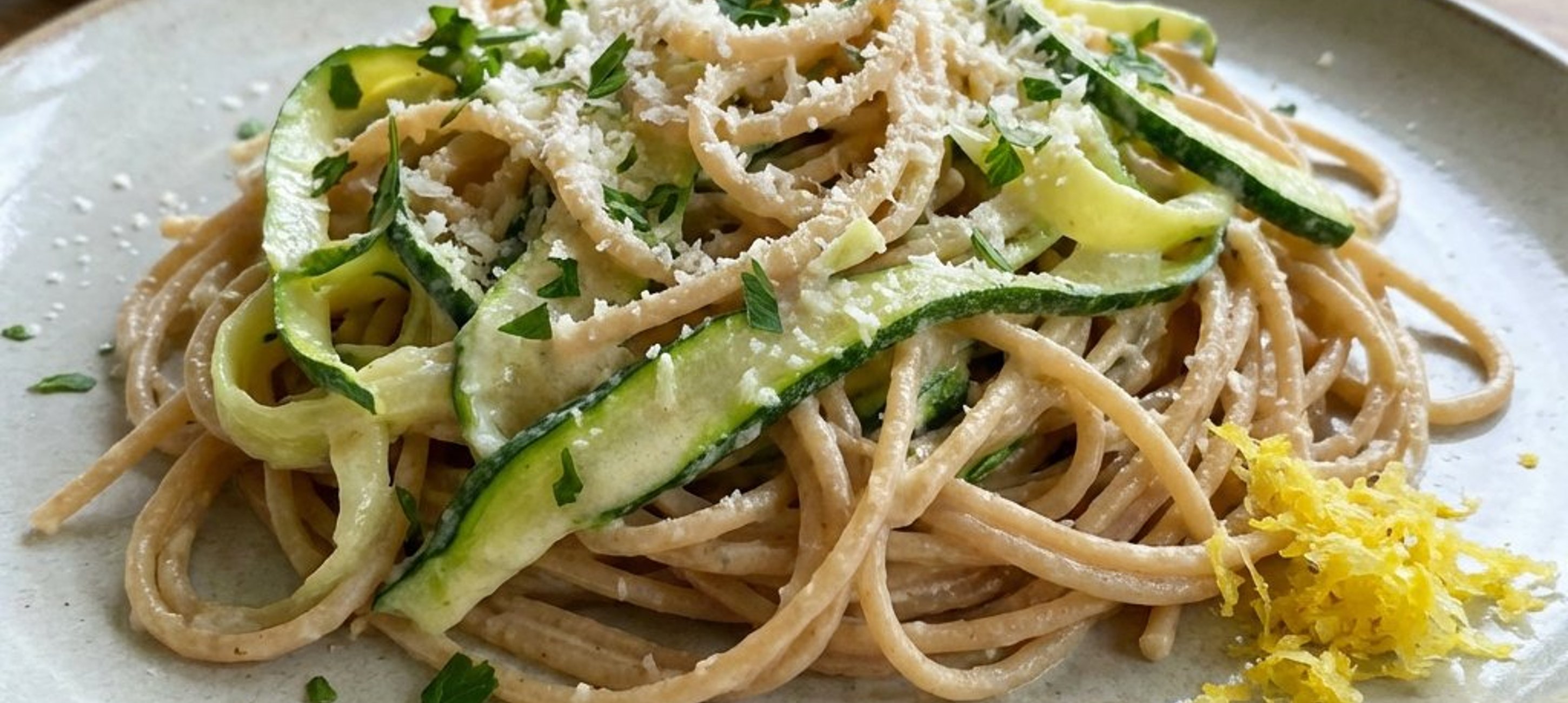 - 2Toarnă în tigaie 100-200 ml din apa păstrată de la paste pentru a subția sosul. Adaugă fâșiile lungi de dovlecel, smântâna de soia, coaja de lămâie rasă, sarea și piperul. Lasă totul să fiarbă împreună timp de 1 minut la foc mediu.