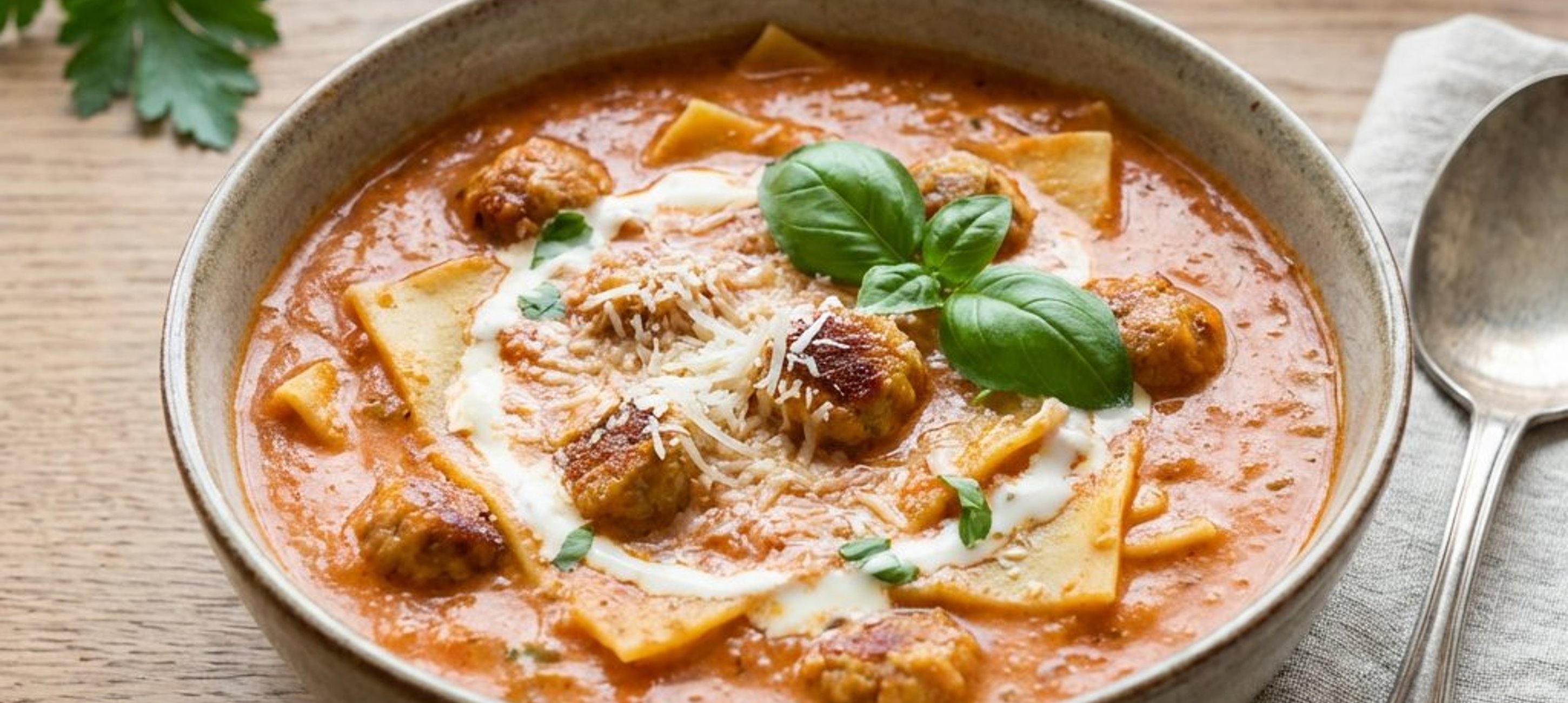 - 2Serviți supa fierbinte cu fâșiile de lasagna, chifteluțele coapte, ardei iute tocat și frunze proaspete de busuioc.