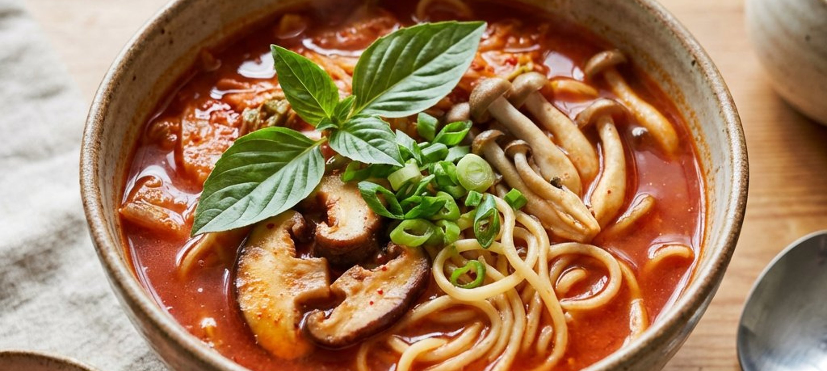 Pentru o experiență autentică, folosiți un kimchi bine fermentat, care va oferi supei o profunzime deosebită a gustului. Servirea cu busuioc Thai proaspăt adaugă o notă aromatică surprinzătoare.