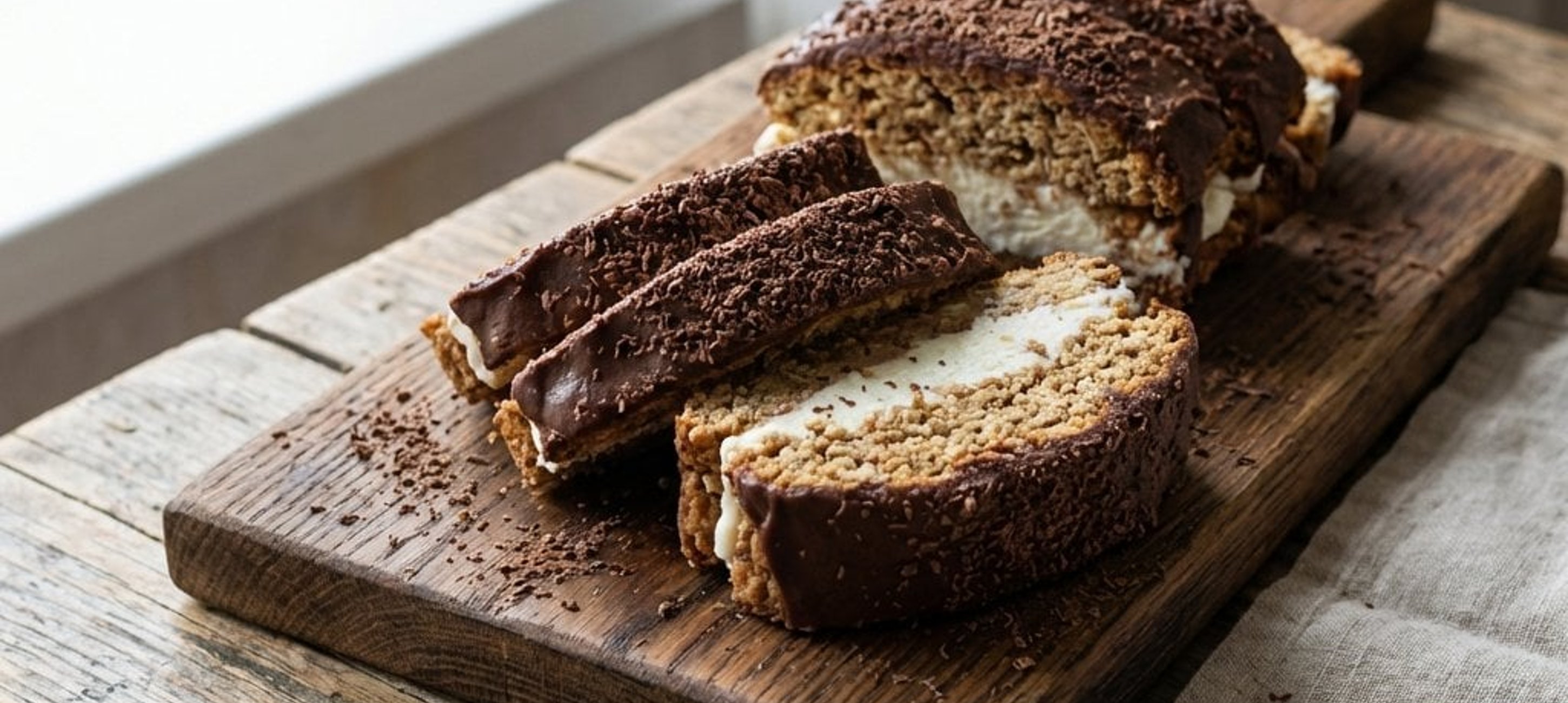 - 2Tapetați o formă de chec sau un vas dreptunghiular (20 cm × 30 cm) cu hârtie de copt. Așezați un strat de biscuiți pe fundul formei, cât mai strâns. Acoperiți cu un strat de cremă de brânză (aprox. 2–2,5 cm grosime). Repetați straturile până la umplerea formei, terminând cu un strat de biscuiți.