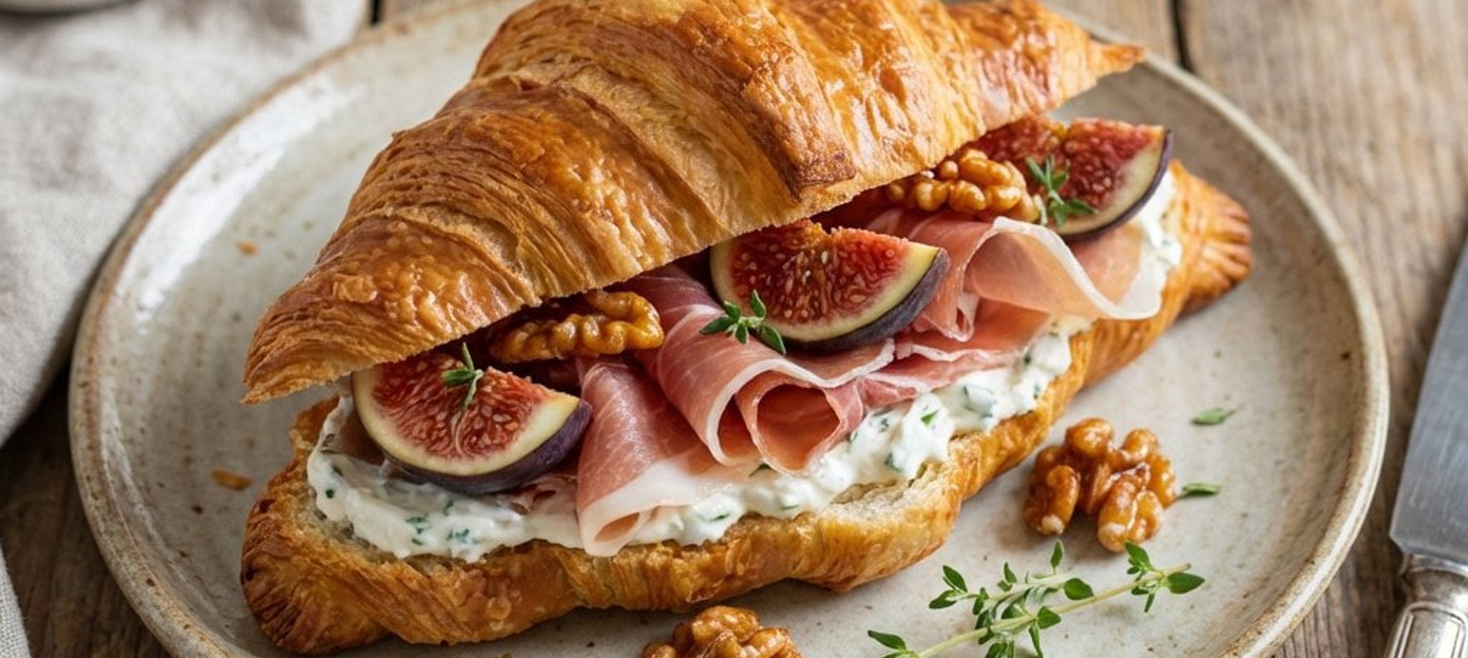 - 3Tăiem croissantele pe lungime. Ungem fiecare bază cu un strat generos de cremă de brânză, așezăm câteva frunze de baby spanac și feliile de prosciutto crudo. Adăugăm smochinele proaspete tăiate în sferturi sau felii subțiri. Presărăm deasupra nucile caramelizate și frunzulițe de cimbru proaspăt.