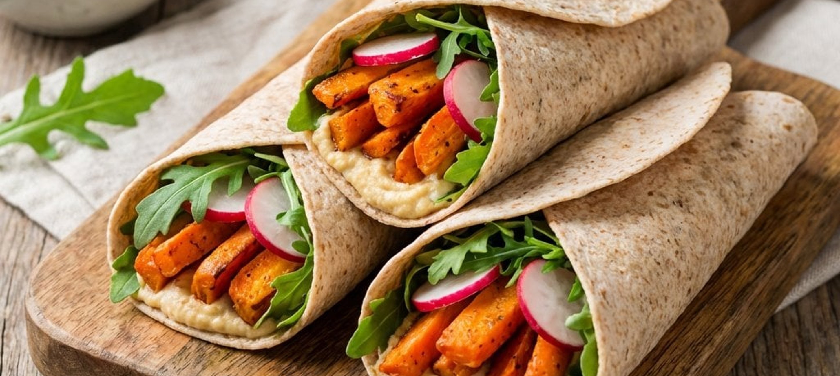 - 1Întendeți hummusul pe fiecare tortilla integrală. Adăugați un strat de rucola proaspătă, bastonașele de morcov copt și ridichile tăiate felii subțiri.