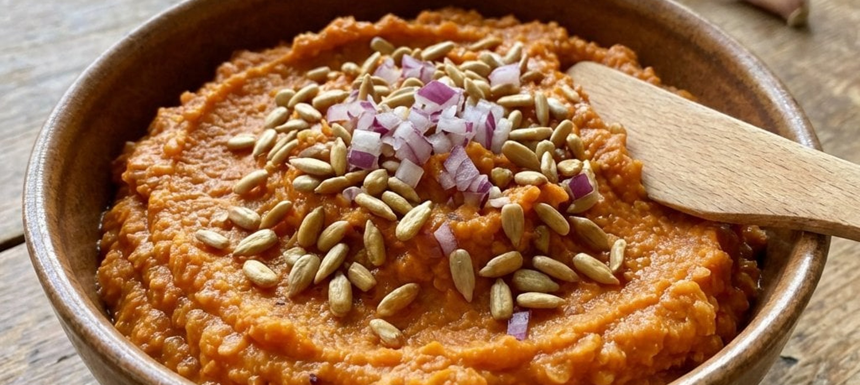 - 5Servire: Decorați cu semințele de floarea-soarelui păstrate (opțional le puteți prăji ușor într'o tigaie fără ulei pentru un plus de aromă) și serviți cu legume proaspete sau pâine prăjită.