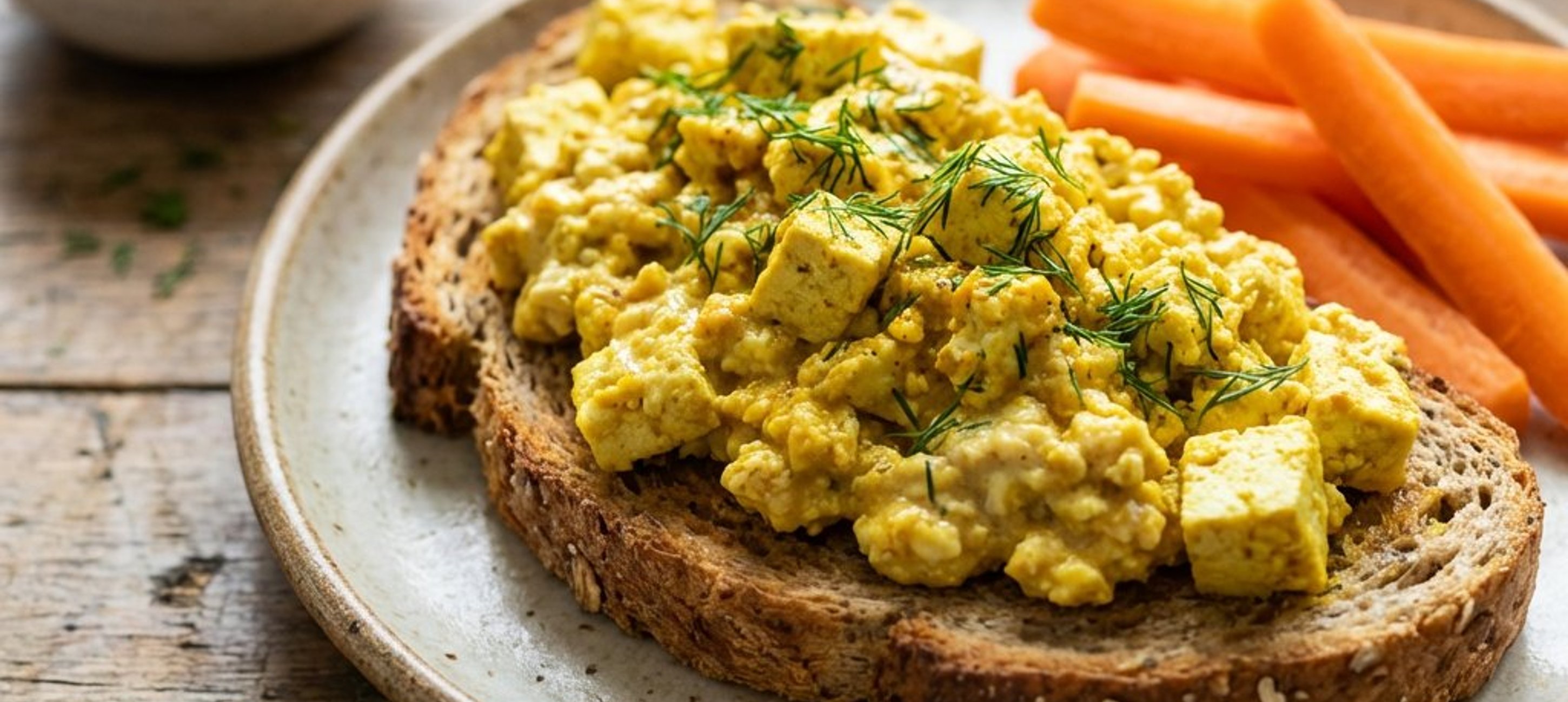 - 4Servește „ouăle” de tofu pe felii de pâine integrală prăjită, alături de morcovi proaspeți tăiați bastonașe și presară ierburi proaspete deasupra.