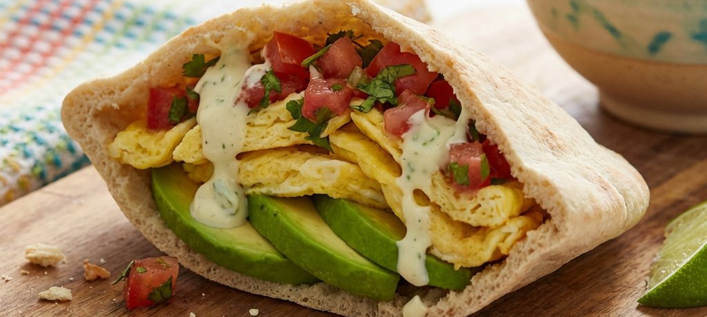 - 1Preîncălziți cuptorul la 230 °C. Stropiți ușor chiflele pita cu apă și coaceți-le pe o tavă cu hârtie de copt timp de aproximativ 5 minute. Tăiați o margine pentru a crea un buzunar. Cât timp pita este încă fierbinte, puneți brânza cheddar în interior pentru a se topi. Umpleți apoi cu fâșii de omletă, felii de avocado, salsa de roșii și ardei jalapeno. Stropiți cu maioneza cu lime și serviți imediat.