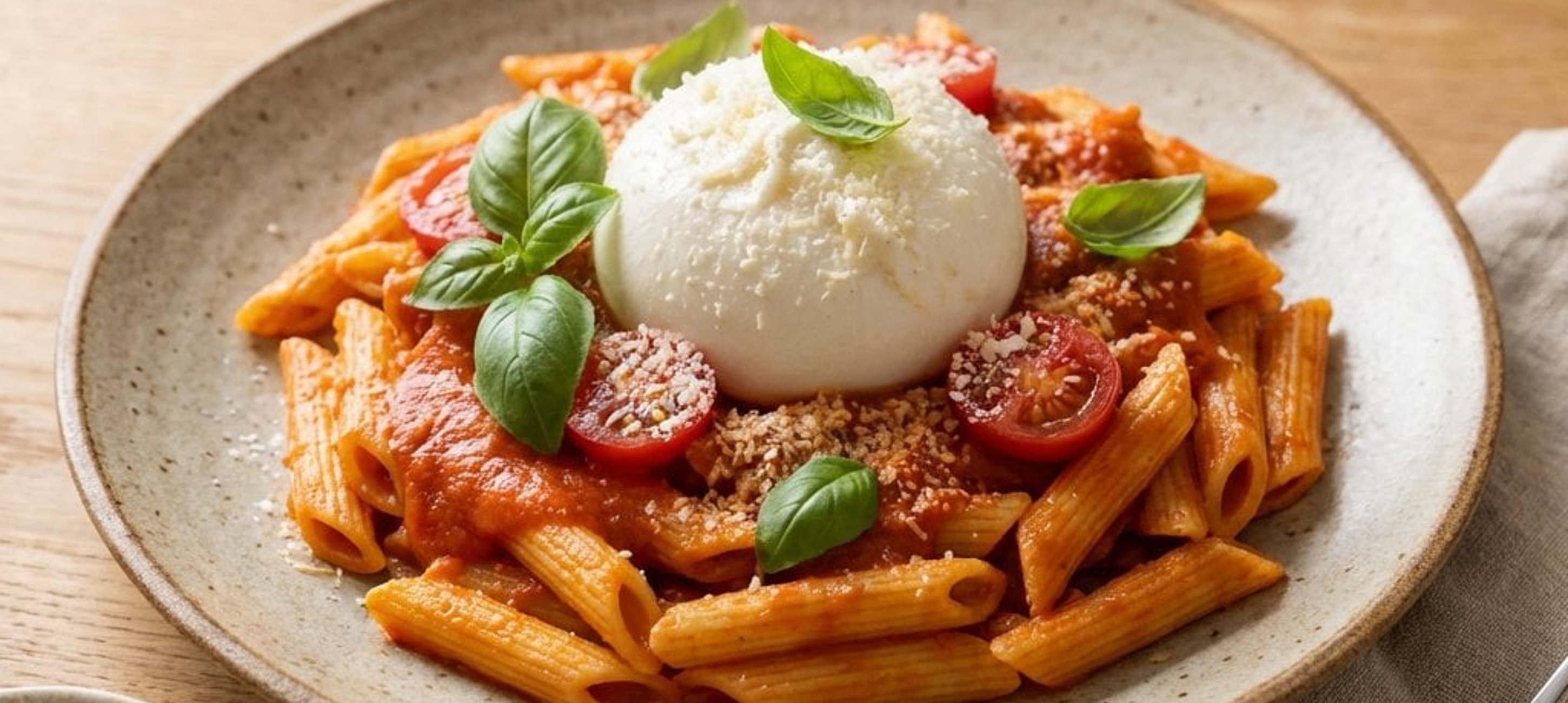 - 5Așezați pastele pe o farfurie, rupeți burrata deasupra, stropiți cu puțin ulei de măsline, adăugați rucola proaspătă și răzuiți parmezanul deasupra. Serviți imediat.