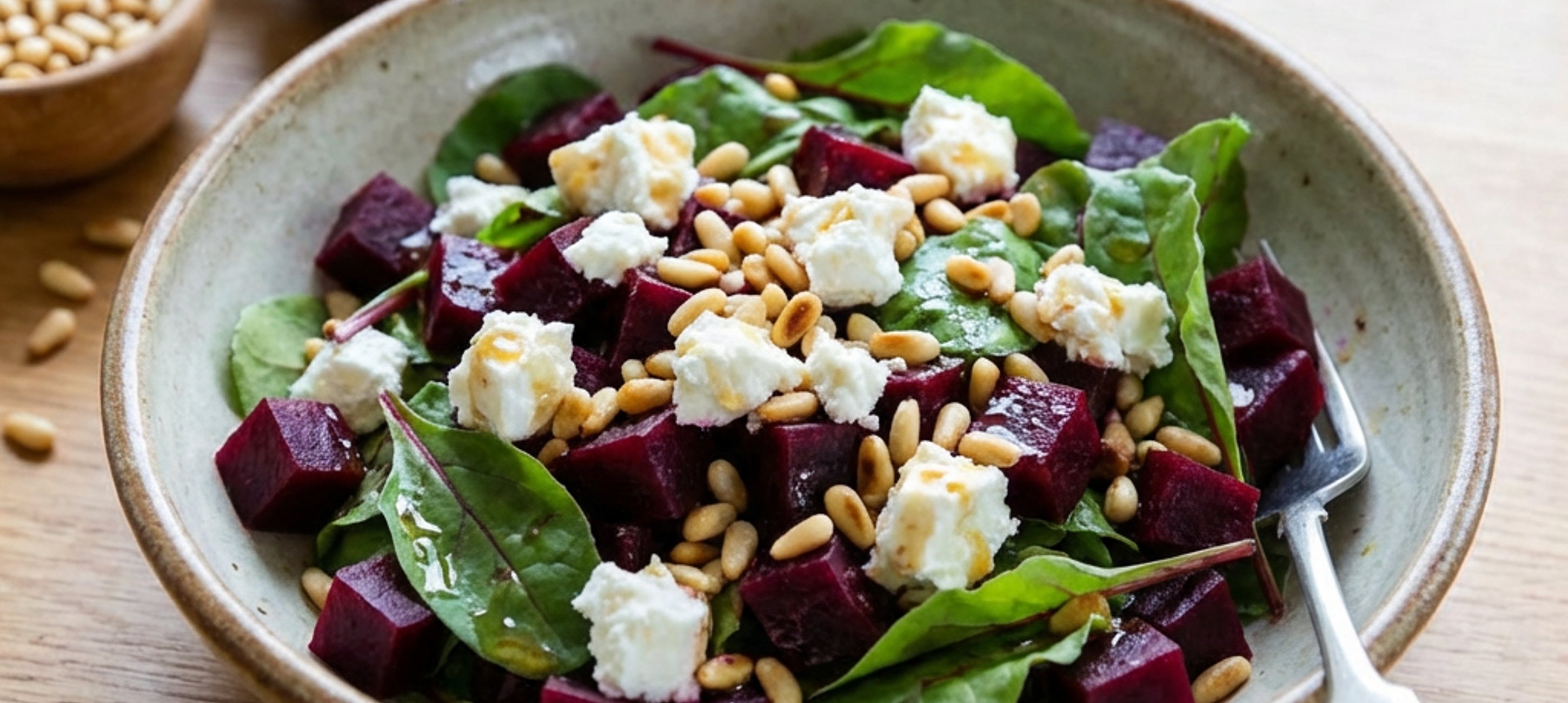 - 4Pentru servire, așază pe farfurii un strat de sfeclă cu dressing, adaugă frunzele de salată, brânza de capră sfărâmată în bucățele și mugurii de pin rumeniți. Stropește totul cu puțin ulei de măsline extra virgin și asezonează cu piper negru proaspăt măcinat.