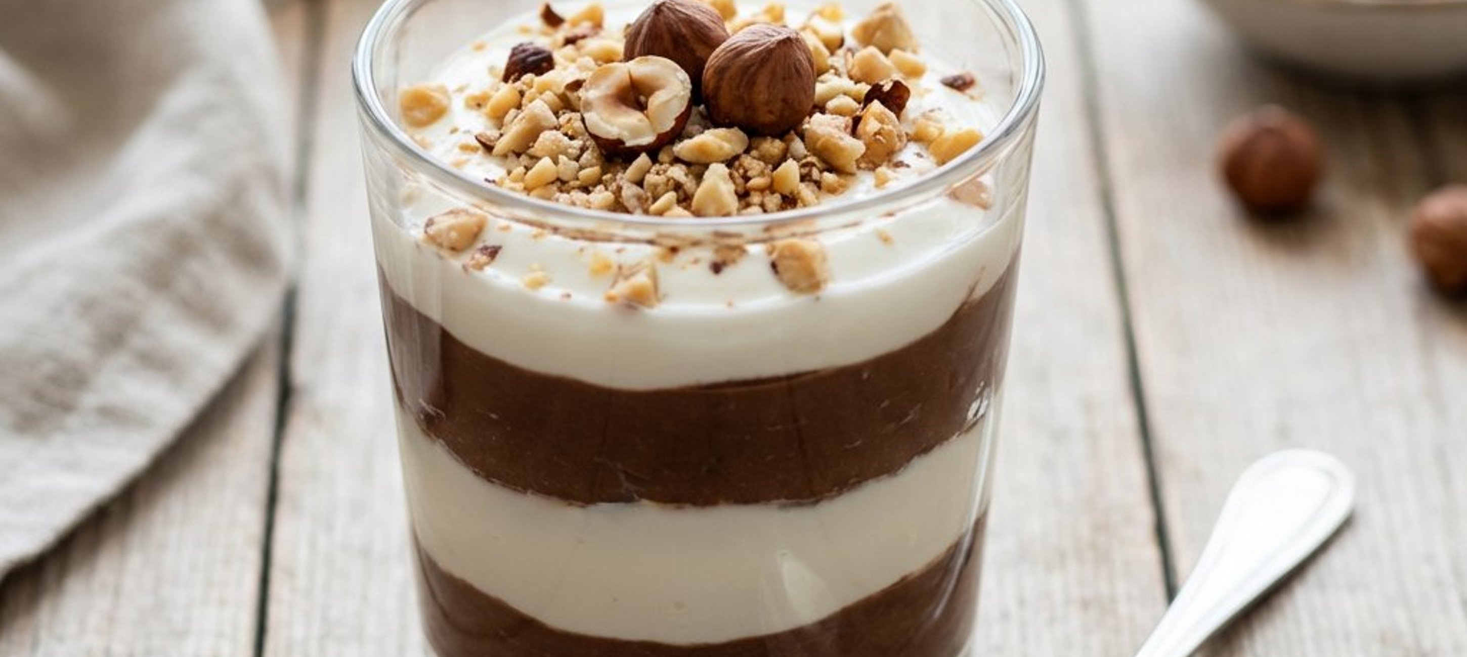 - 2Pregătiți 3 pahare și distribuiți cele două creme în 4 straturi alternative: începeți cu un strat de cremă de ciocolată (aproximativ jumătate din cantitate), urmat de un strat de cremă de smântână (jumătate din cantitate), apoi restul de cremă de ciocolată și terminați cu restul de cremă de smântână.