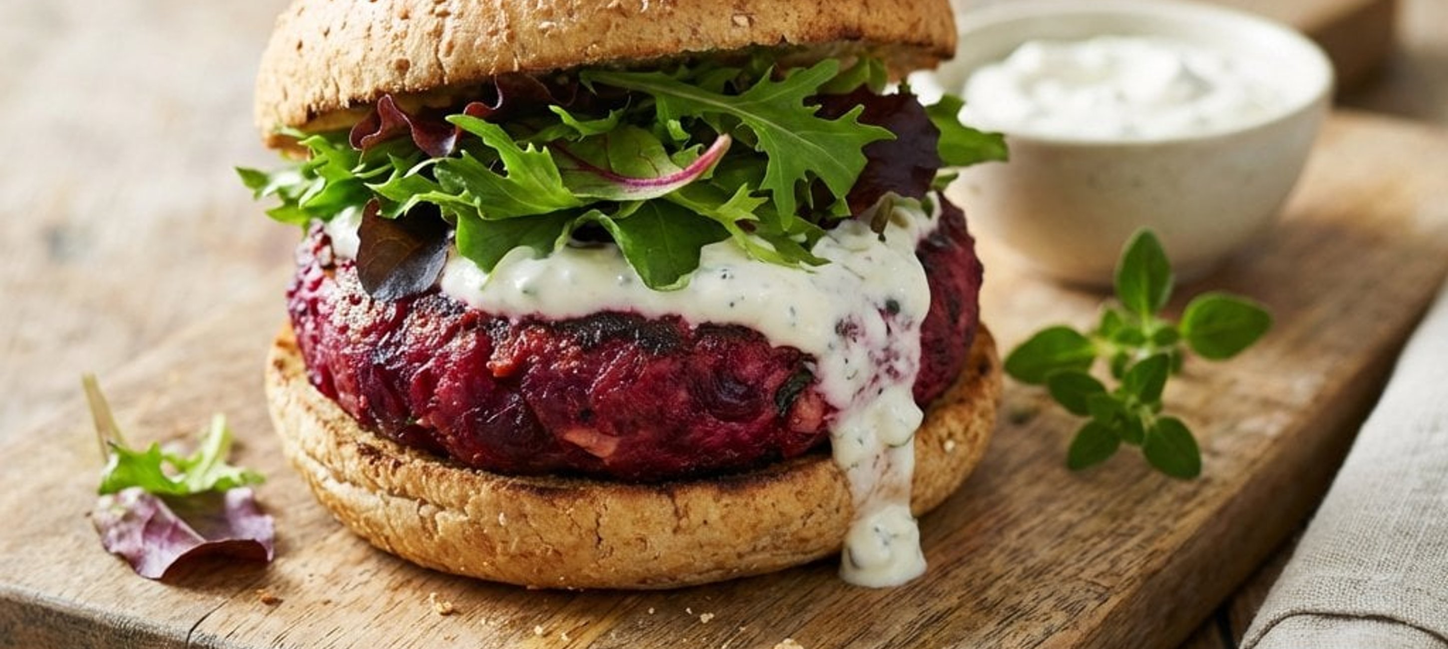 - 3Asamblează burgerul: unge baza chiflei cu dip de brânză de capră, adaugă câteva frunze de salată, așază burgerul cald, mai adaugă puțin dip și salată, apoi acoperă cu cealaltă jumătate de chiflă. Servește imediat!