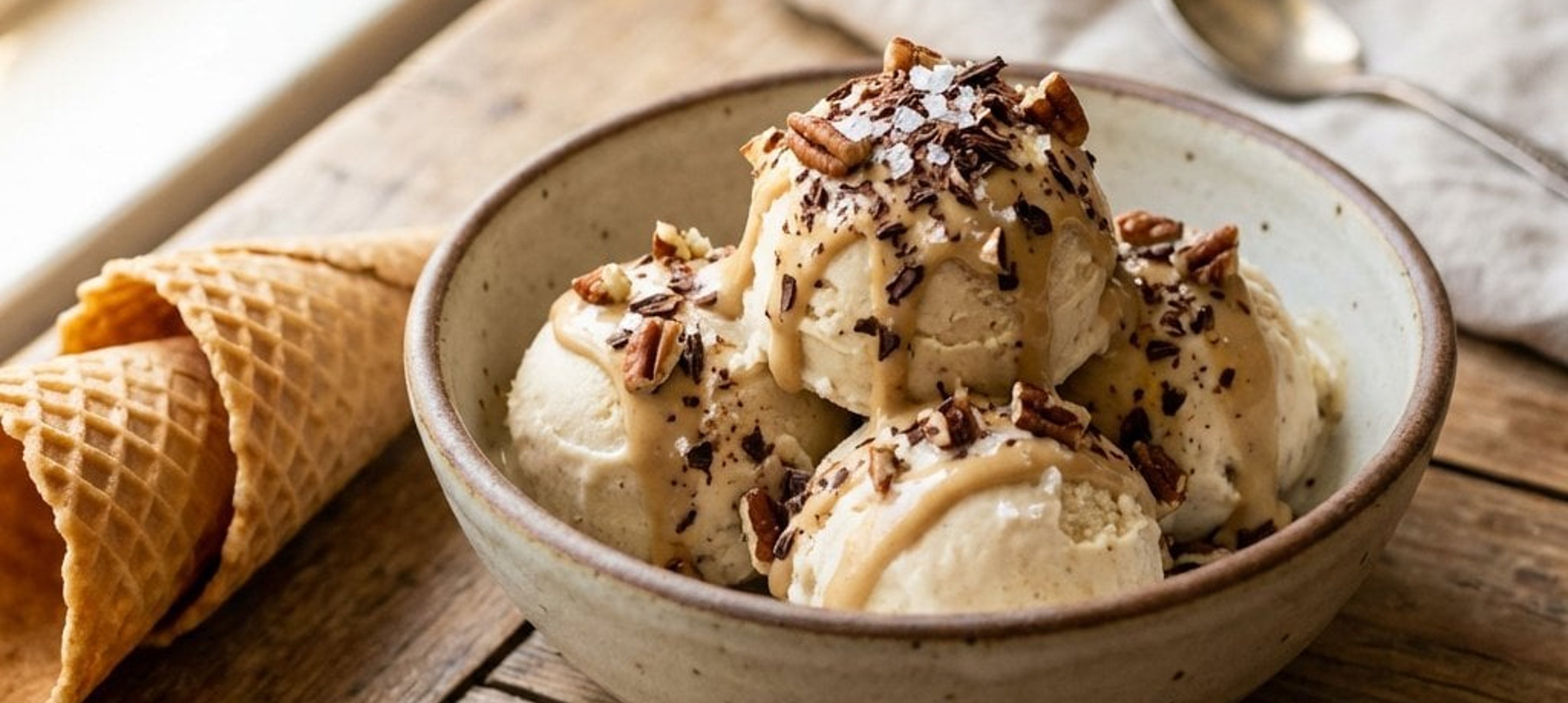 - 3Turnați amestecul într-un recipient și puneți-l la congelator, ideal peste noapte (minim 6 ore). Serviți înghețata în cornete, presărată cu nuci, ciocolată și chipsurile de banane uscate.