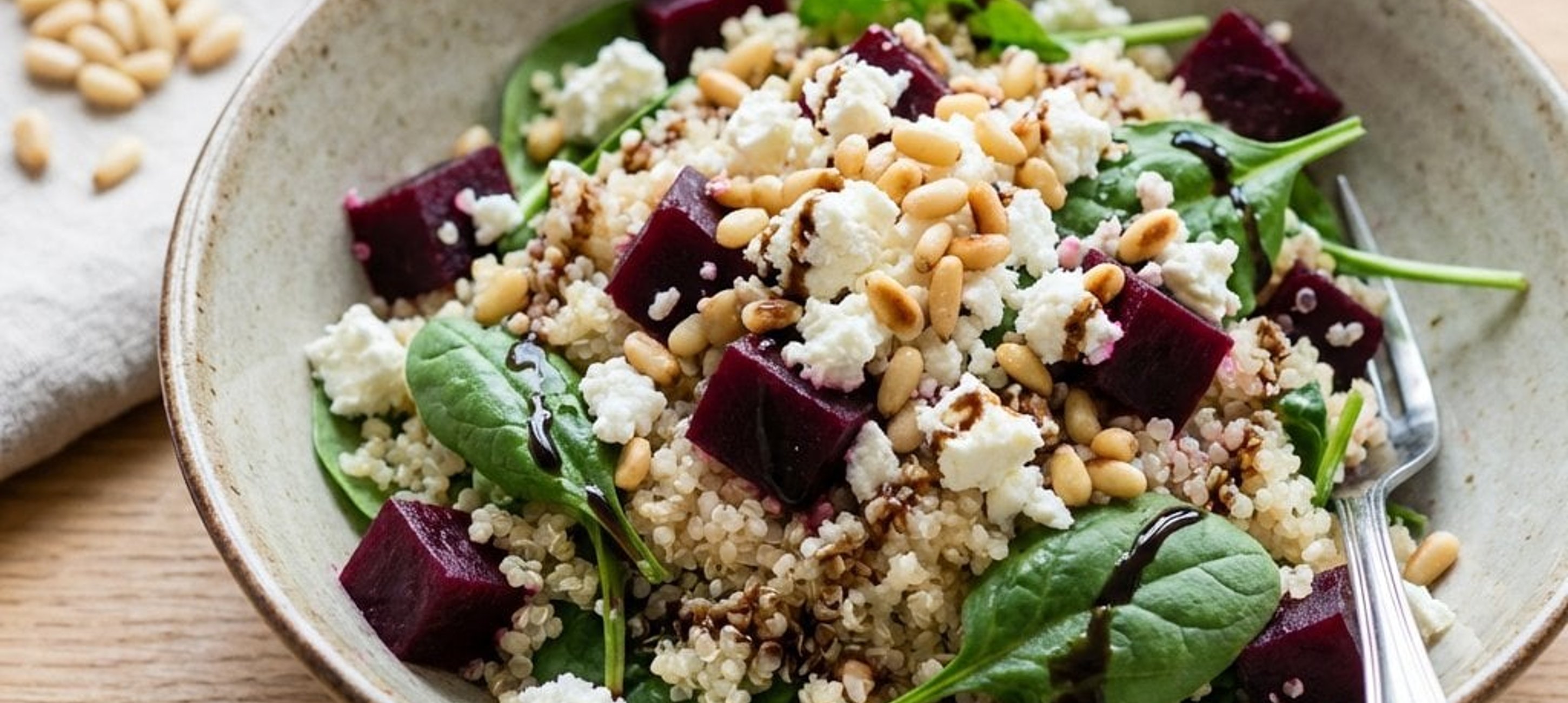 - 1Spălați spanacul baby și lăsați-l să se scurgă bine de apă. Într-un bol mare, amestecați spanacul cu sfecla roșie marinată și quinoa fiartă.