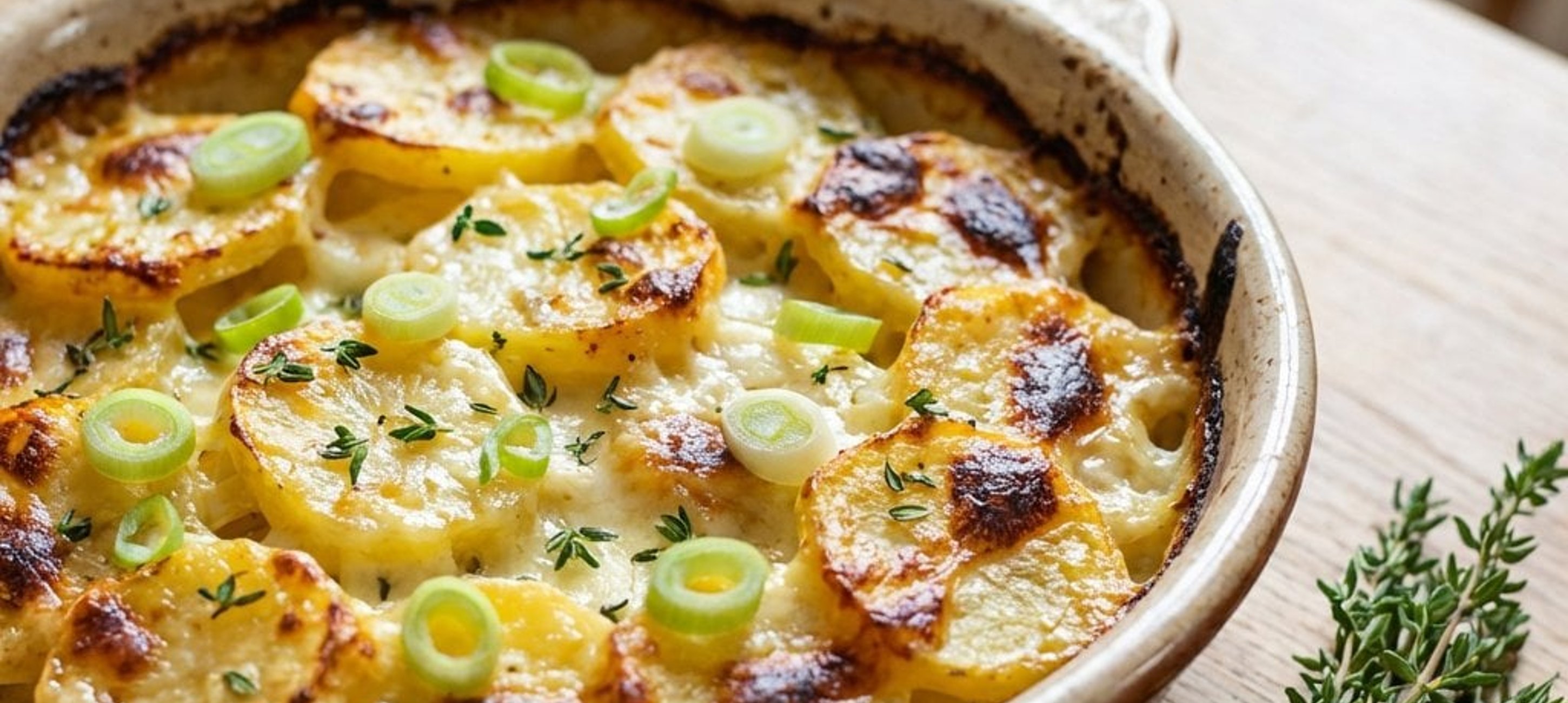 - 1Preîncălziți cuptorul la 180 °C (căldură sus și jos). Curățați cartofii și tăiați-i în felii subțiri. Într-o cratiță mică, încălziți smântâna cu jumătate din cantitatea de unt, dar fără a o fierbe. Adăugați usturoiul zdrobit, frunzele de la 4 fire de cimbru, sarea, piperul și nucșoara. Opriți focul și lăsați brânza de oaie să se topească în smântâna caldă.