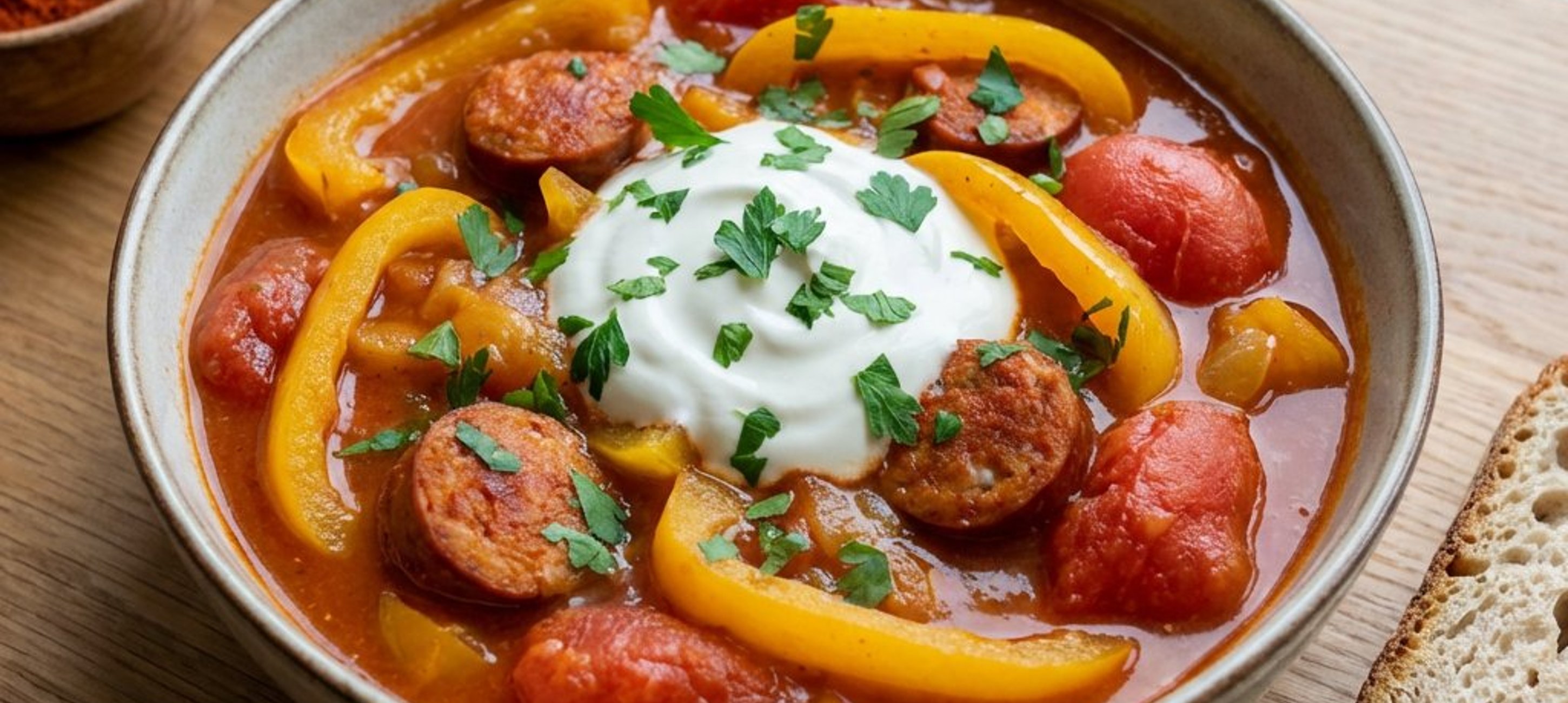 - 1Serviți lecsó-ul cald, cu o lingură generoasă de smântână fermentată deasupra și alături de felii de pâine proaspătă.