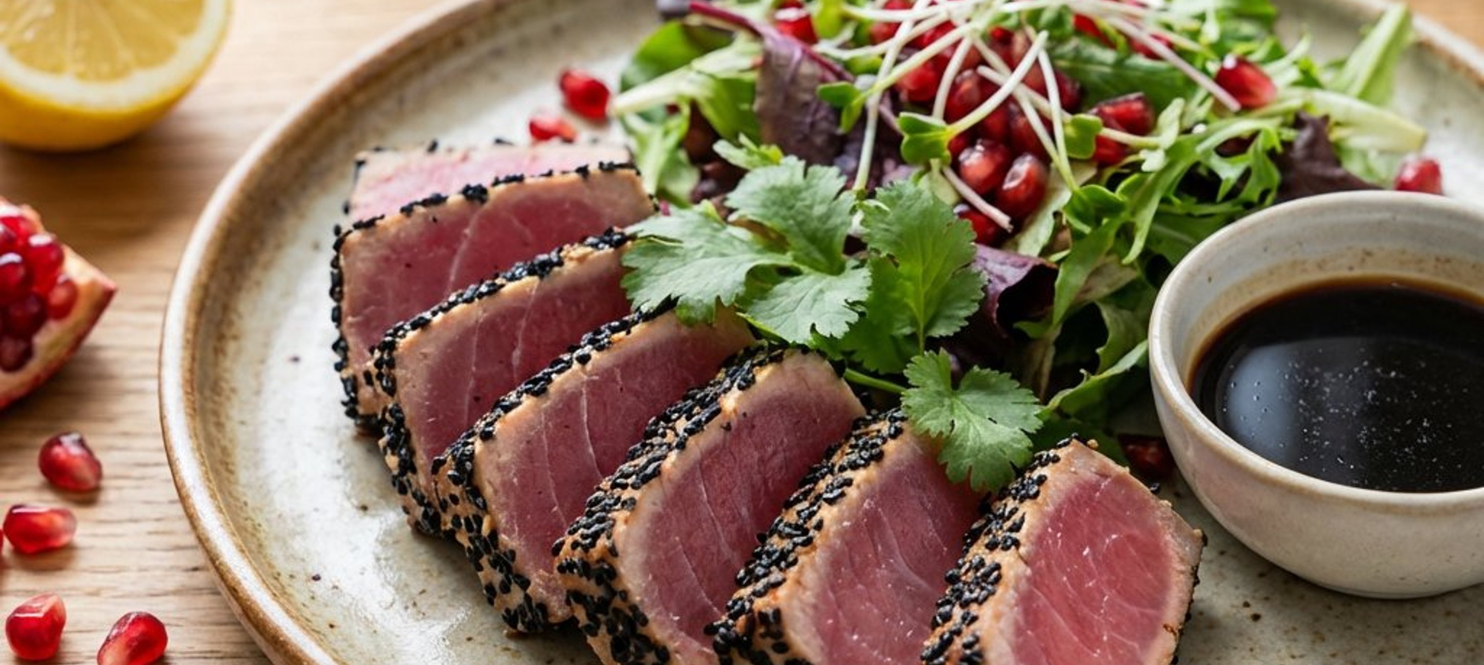 - 3Amestecă mixul de salată cu dressingul, vlăstarii de ridiche și semințele de rodie. Servește steak-ul de ton tăiat felii groase, alături de salata proaspătă. Presară coriandru verde deasupra și stropește cu puțin suc de lămâie înainte de servire.