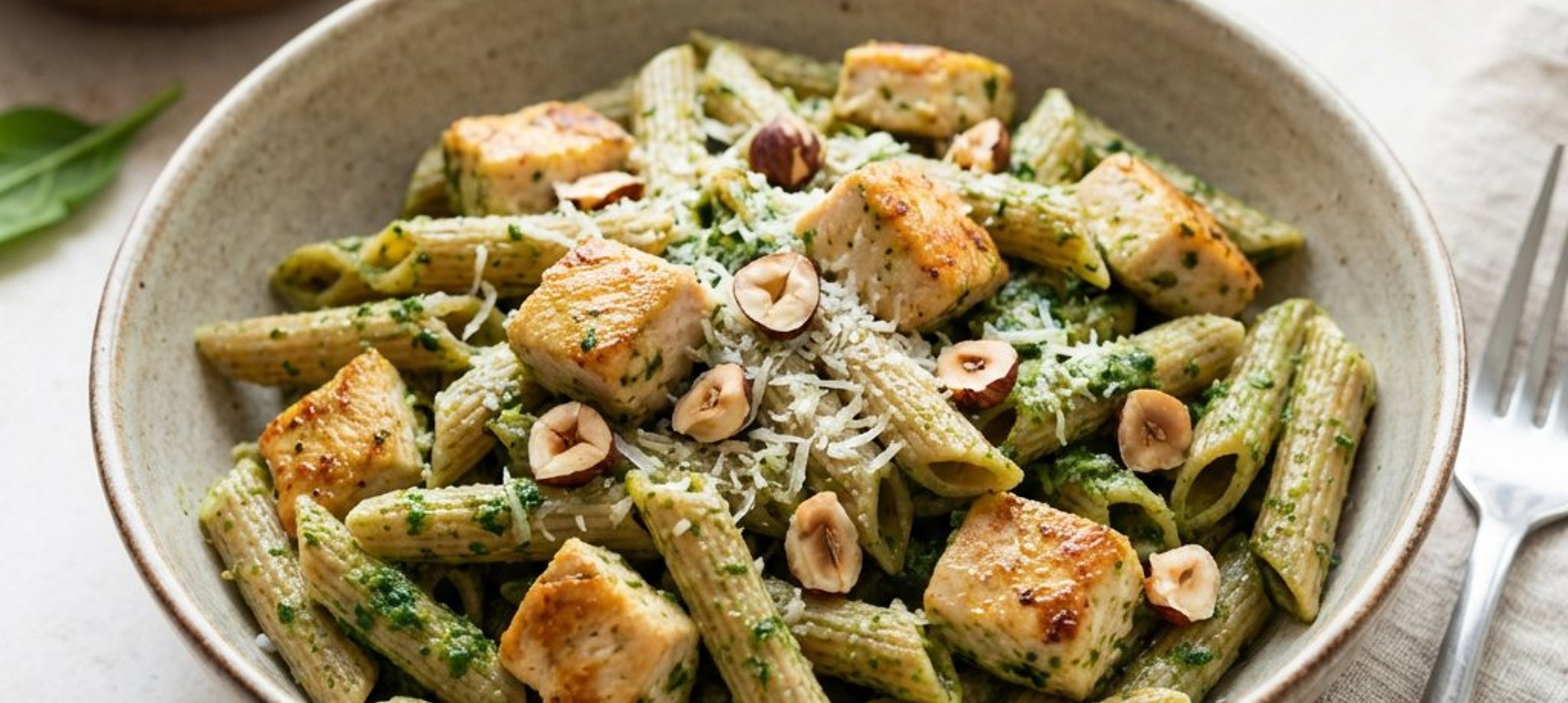 - 2Scurgeți pastele fierte și amestecați-le cu pestoul de spanac și cubulețele de pui sote. Împărțiți în 4 porții și serviți imediat.