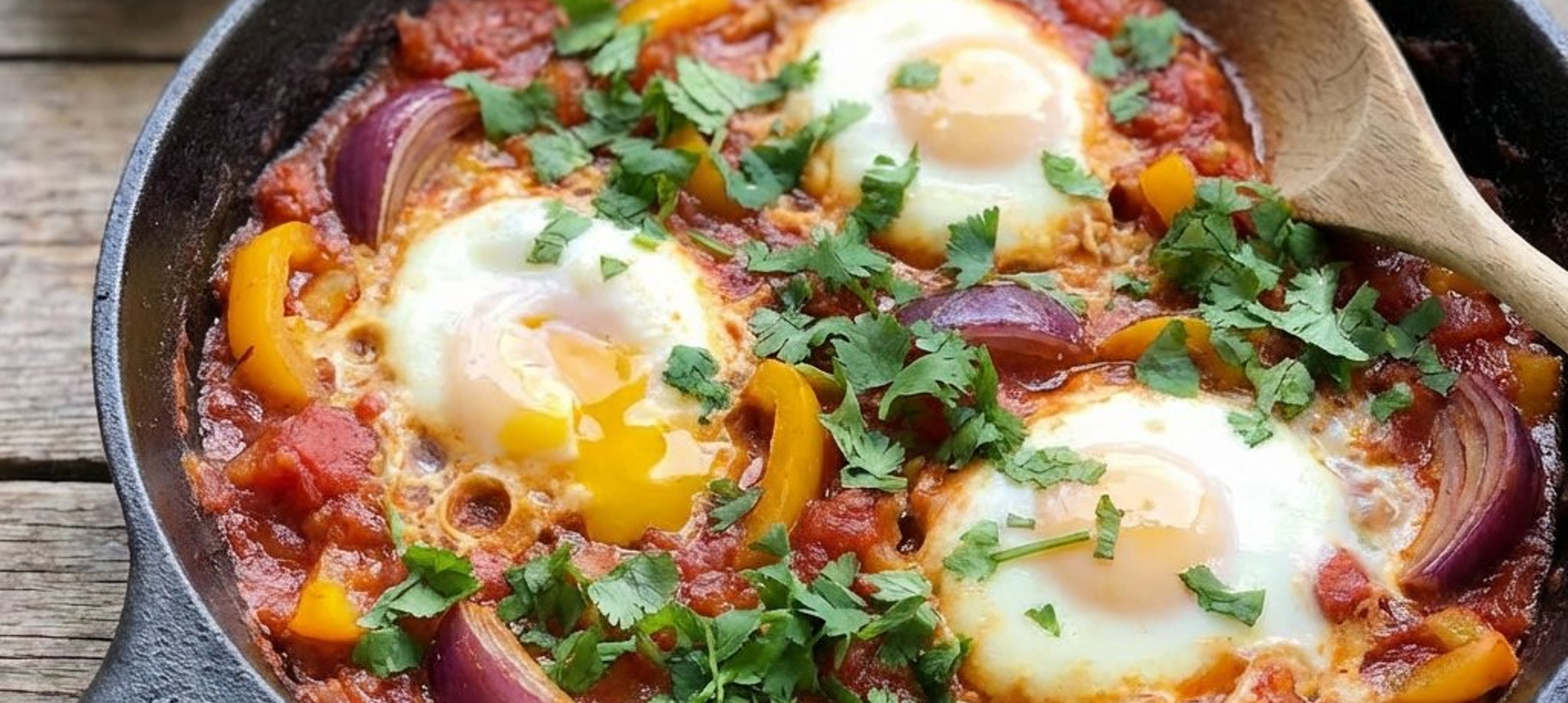 Shakshouka este un preparat tradițional din Africa de Nord și Orientul Mijlociu. Deși există multe variante, baza este întotdeauna formată din ouă, roșii, ardei și chimion. Pentru un plus de savoare, puteți adăuga puțină brânză feta sfărâmată deasupra înainte de servire.