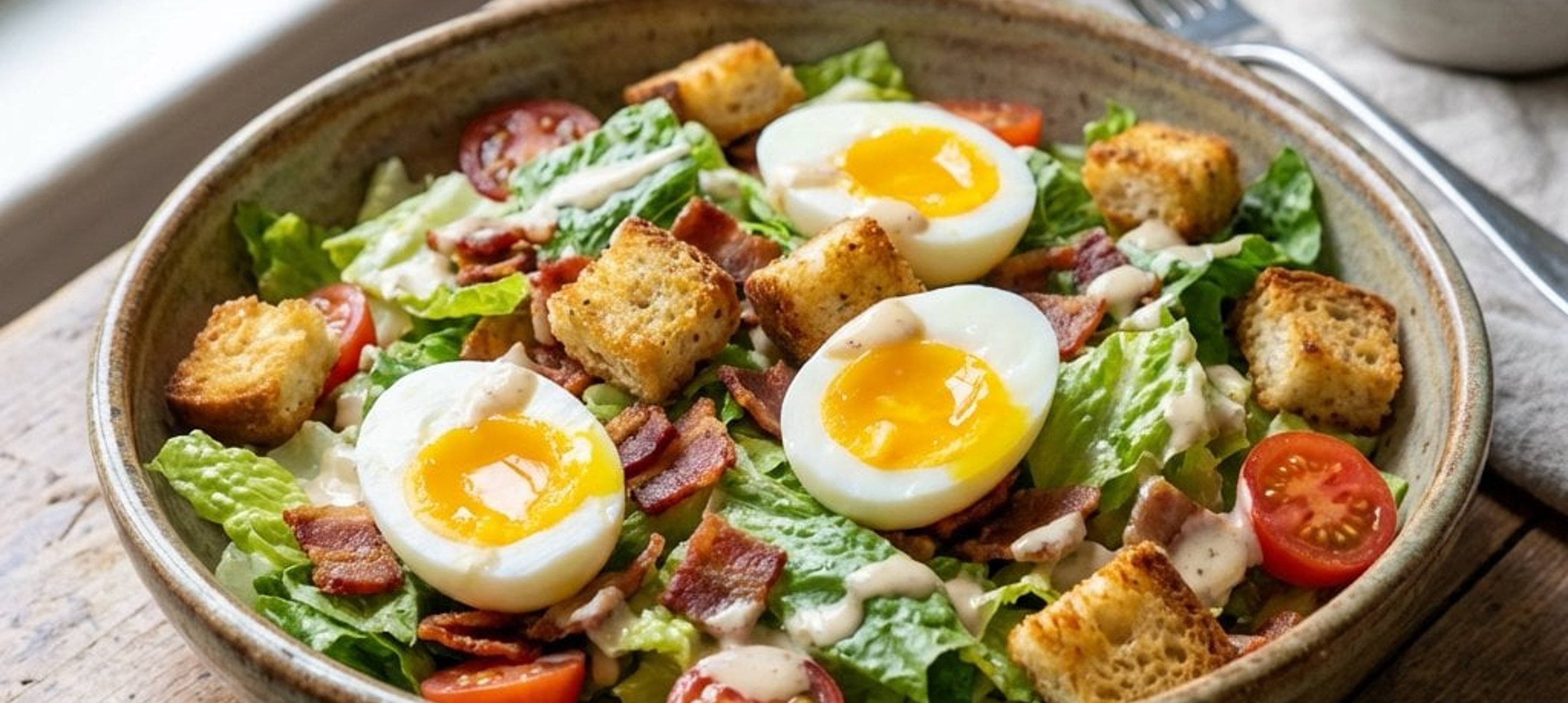 - 1Spălați și tăiați salata romană în bucăți potrivite, iar roșiile în felii sau cubulețe. Într-un bol mic, amestecați maioneza cu sucul de lămâie până obțineți un dressing omogen. Într-un bol mare de salată, combinați frunzele de salată cu roșiile, crutoanele crocante și baconul rupt în bucățele. Turnați dressingul deasupra, amestecați ușor și serviți cu ouăle tăiate în jumătăți și arpagic verde tocat mărunt.