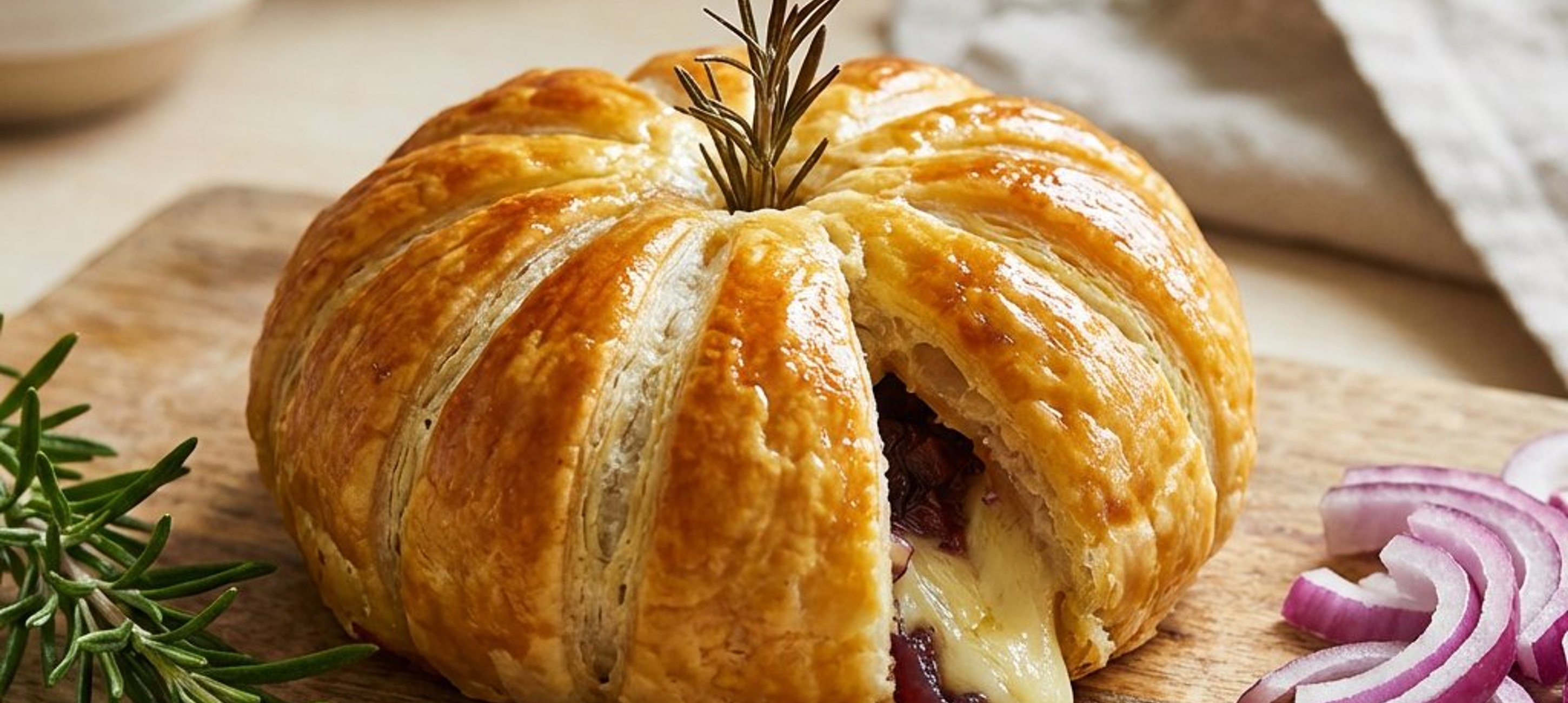 - 1Întinde foile de aluat foietaj și decupează colțurile pentru a obține o formă aproximativ rotundă (nu trebuie să fie un cerc perfect). În centrul fiecărei bucăți de aluat, pune o porție generoasă de chutney de ceapă, iar deasupra așază o bucată întreagă de brânză Camembert. Adu marginile aluatului peste brânză și strânge-le bine cu degetele pentru a forma o bilă sigilată. Folosește sfoară de bucătărie pentru a lega bila de aluat în 4 locuri, astfel încât să fie împărțită vizual în 8 segmente, imitând forma unui dovleac. Unge aluatul cu oul bătut și puțină sare.