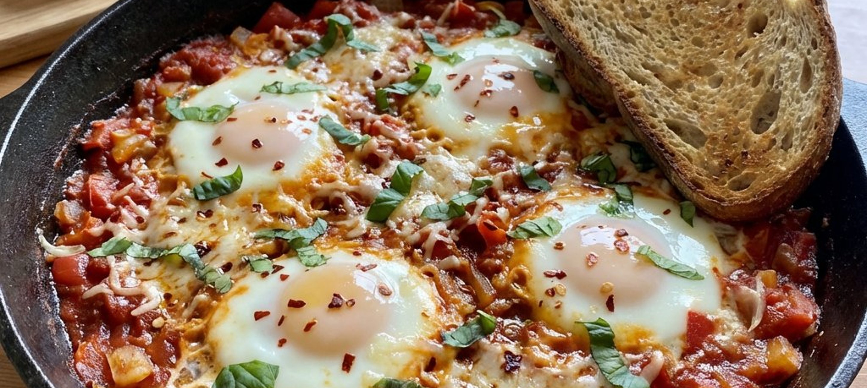 - 1Luați tigaia de pe foc și presărați deasupra busuiocul tăiat și fulgii de chilli. Împărțiți în 2 porții și serviți imediat alături de felii de pâine prăjită.