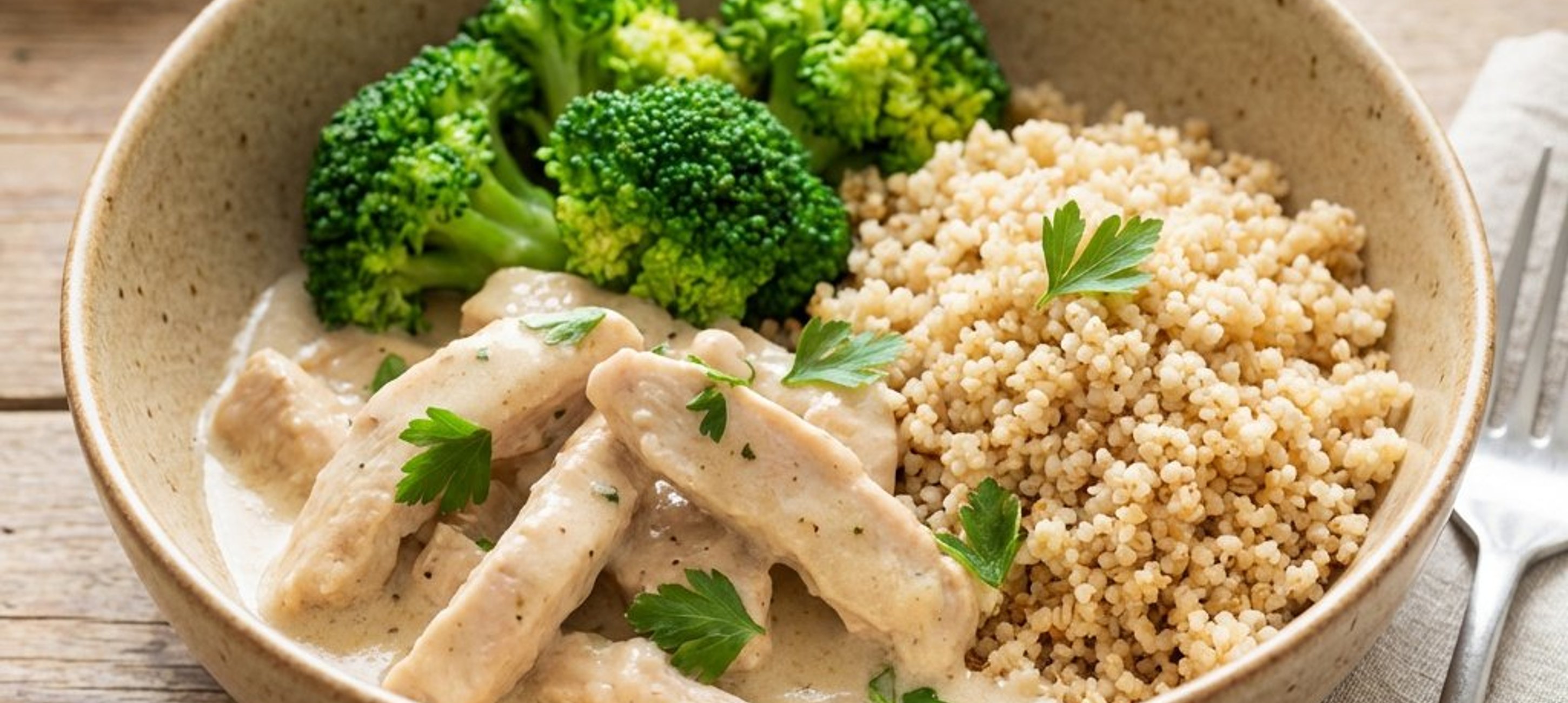 - 2Turnați smântâna de soia peste carne, adăugați broccoli fiert și lăsați totul să se încălzească împreună încă 3 minute. Serviți amestecul de curcan alături de cușcușul pregătit.