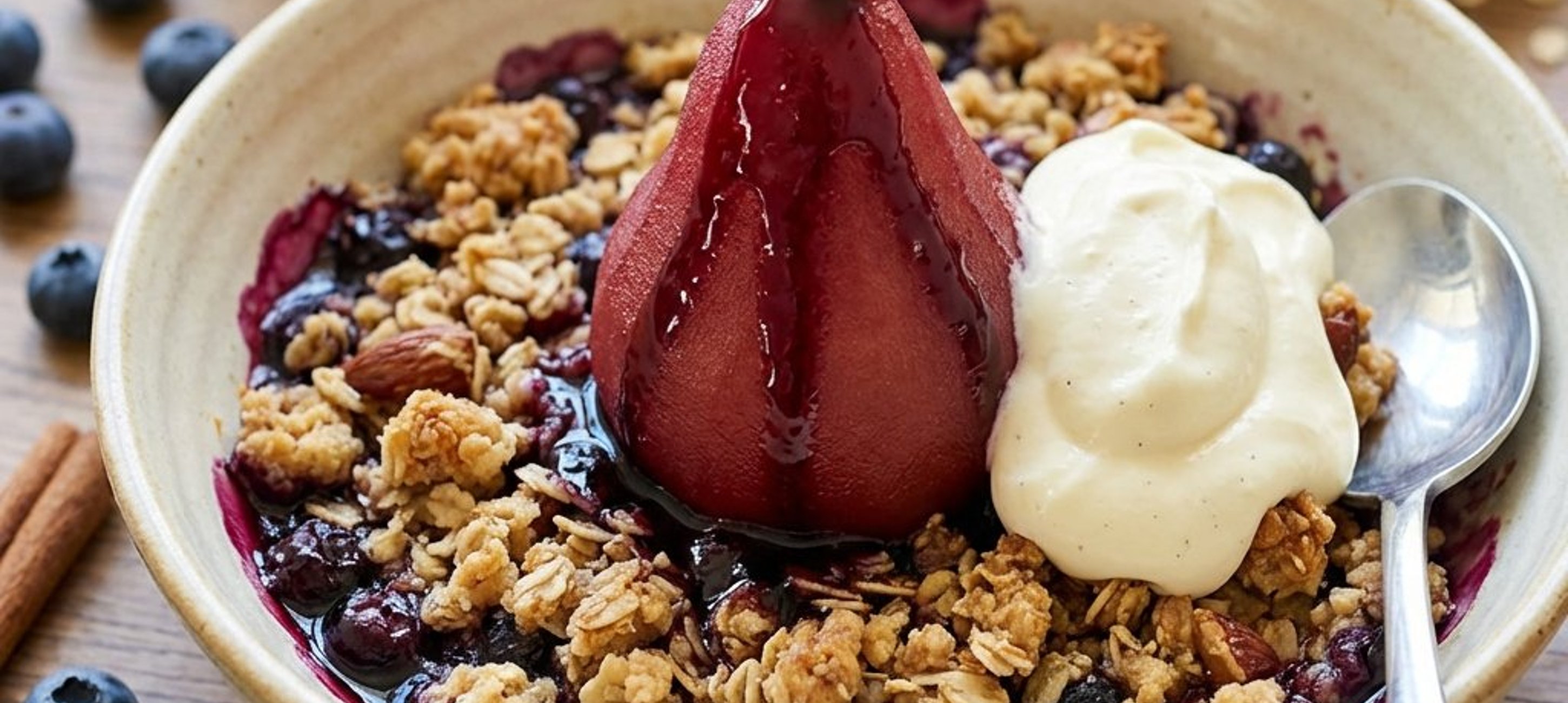 - 3Serviți crumble-ul cald direct din formă. Puneți pe fiecare porție o lingură generoasă de cremă de vanilie, o pară poșată și stropiți totul cu siropul aromat.