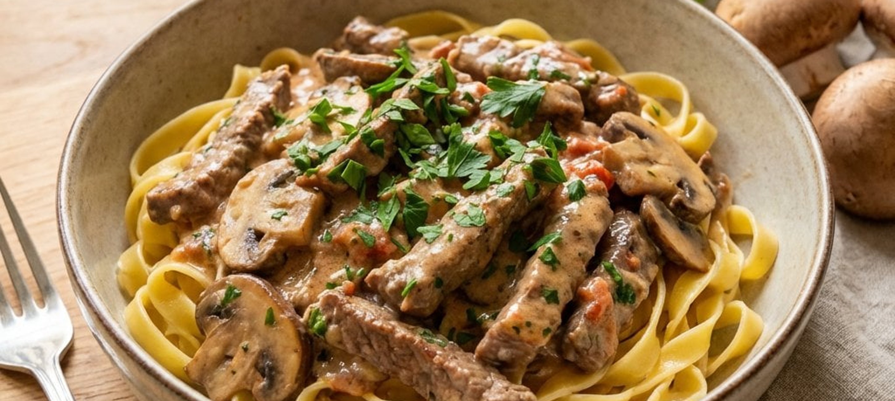 - 4Amestecă smântâna fermentată cu făina și adaugă compoziția peste amestecul de carne. Mai fierbe totul împreună timp de 3 minute. Adaugă pătrunjelul tocat și, dacă mai este nevoie, potrivește gustul cu sare și piper. Servește sosul fierbinte peste pastele tagliatelle fierte conform instrucțiunilor de pe pachet.