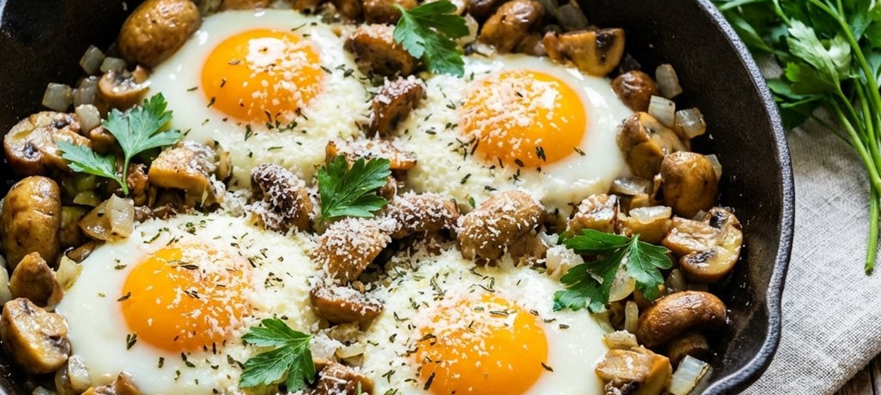 - 3Faceți patru mici adâncituri în amestecul de ciuperci și spargeți câte un ou în fiecare. Presărați parmezanul ras peste tot preparatul. Introduceți tigaia în cuptorul preîncălzit și coaceți timp de 4–5 minute, până când albușul este setat, dar gălbenușul rămâne moale. Serviți imediat.
