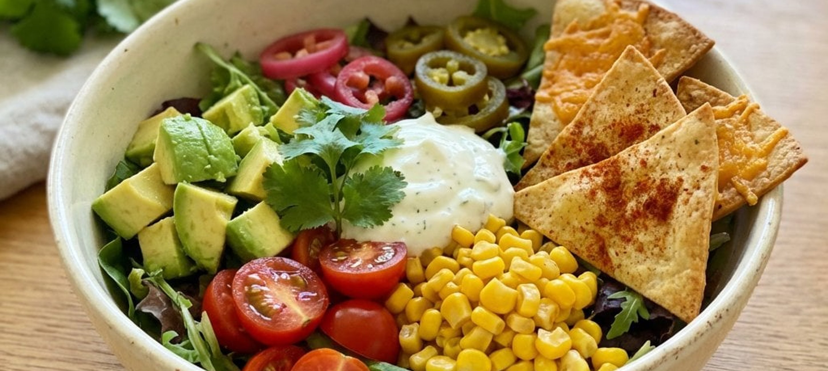 - 5Asamblare: Așază mixul de salată pe farfurii. Adaugă amestecul de roșii, cubulețele de avocado, porumbul scurs, restul de cheddar ras, sosul de smântână și chipsurile de tortilla crocante. Servește imediat. Poftă bună!