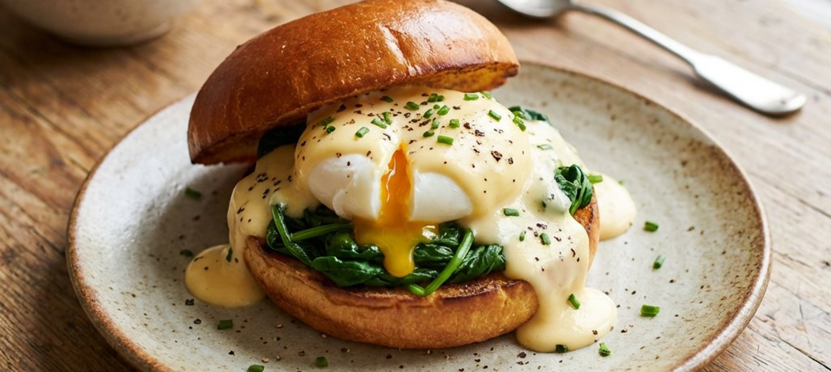 - 2Asamblare: Pe baza fiecărei chifle, așezați o porție de spanac înăbușit. Puneți deasupra oul poșat (scurs bine de apă), turnați sosul cald de brânză și acoperiți cu cealaltă jumătate de chiflă. Serviți imediat.
