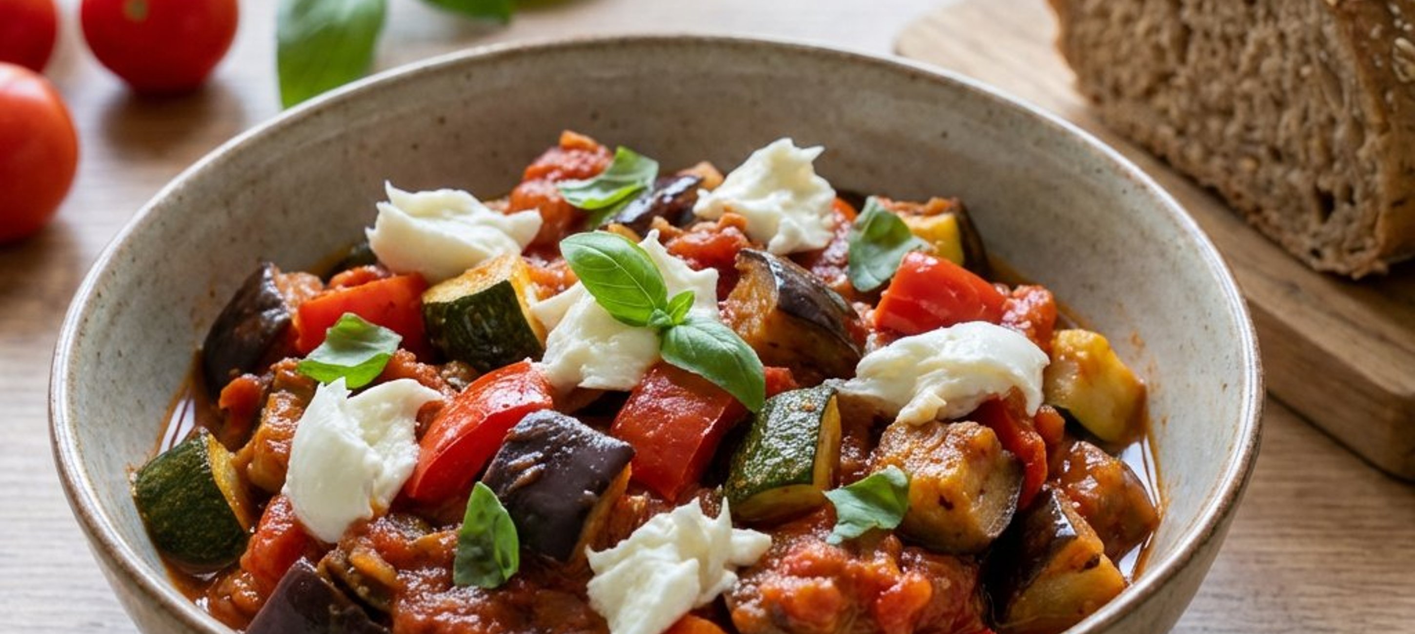 - 5Asamblare: Amestecă legumele coapte cu sosul pregătit și busuiocul proaspăt. Servește pe farfurie alături de mozzarella, stropește cu puțin ulei de măsline, decorează cu frunze de busuioc și însoțește totul cu pâine integrală.