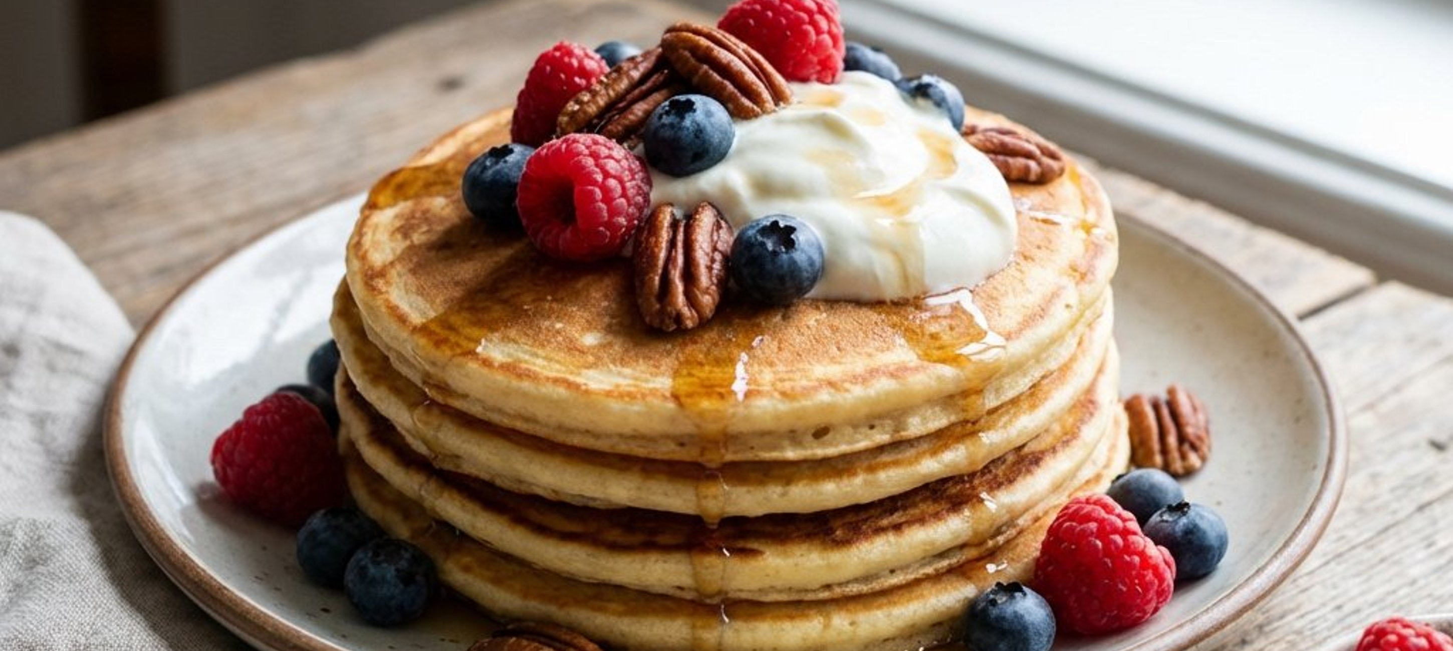 - 1Aranjați clătitele pe farfurii și serviți-le cu o lingură generoasă de smântână fermentată, zmeură și afine proaspete, și presărați deasupra nuci pecan crocante. Poftă bună!
