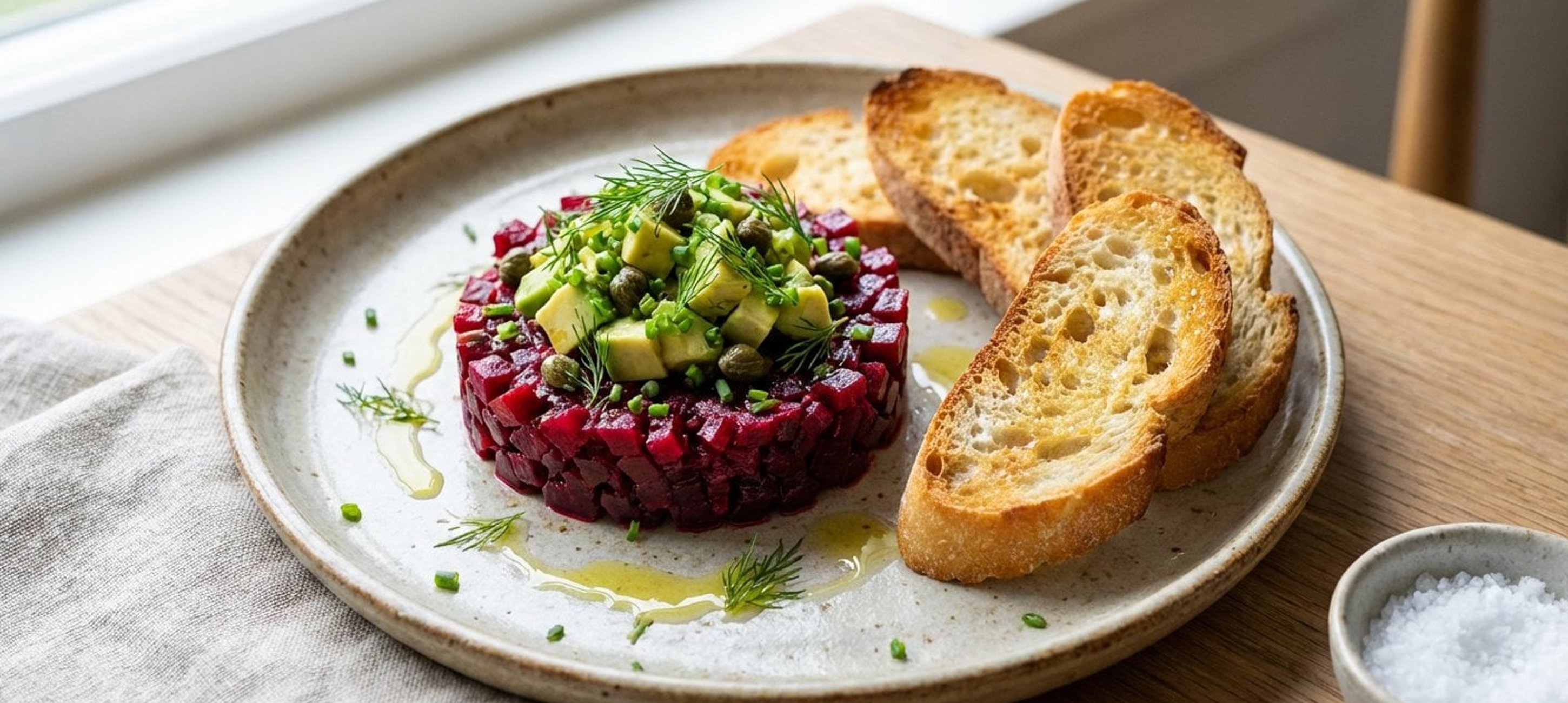 Pentru un aspect profesional, folosiți un inel metalic pentru a monta tartarul pe farfurie. Decorul cu lăstari proaspeți sau semințe de susan negru adaugă un contrast vizual excelent.