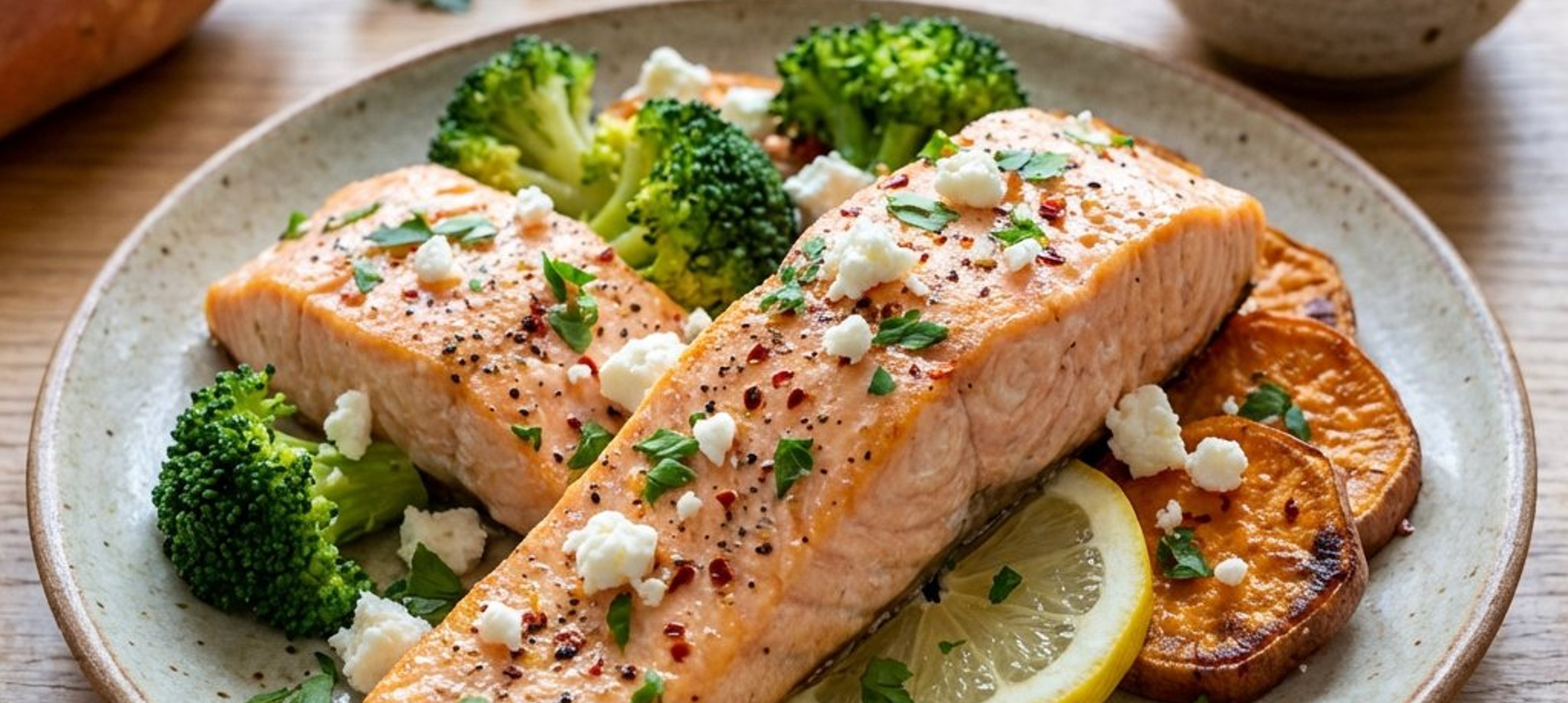 - 2Curățați cartofii dulci și tăiați-i în felii subțiri. Desfaceți broccoli în buchețele mici, iar lămâia tăiați-o în felii subțiri. Într-o crăticioară mică, topiți untul la foc mic (va dura 1–2 minute). Puneți feliile de cartofi dulci, feliile de lămâie și buchețelele de broccoli în tava pregătită. Adăugați sarea, piperul, chilli-ul măcinat și untul topit, apoi amestecați bine totul. Așezați fileurile de somon deasupra amestecului de legume, asezonându-le cu sare și piper. Introduceți tava în cuptor și coaceți timp de 20–25 de minute la 180–185 °C.