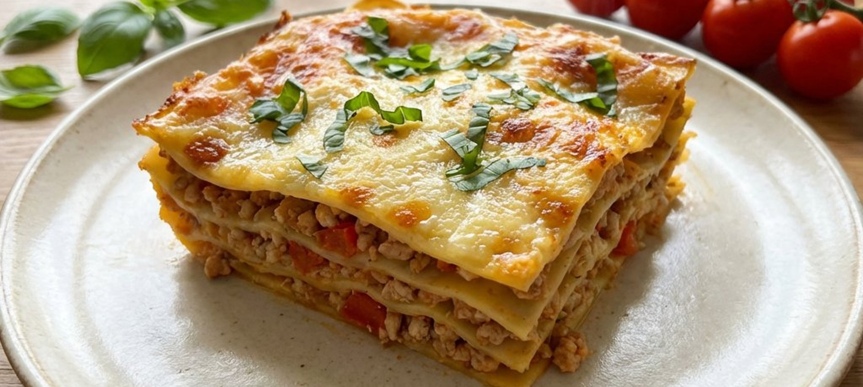 Pentru un gust și mai intens, poți folosi roșii bine coapte de grădină și busuioc proaspăt tăiat chiar înainte de a-l adăuga în compoziție. Cartoful ras fin acționează ca un agent natural de îngroșare, menținând lasagna suculentă fără a fi nevoie de sos B