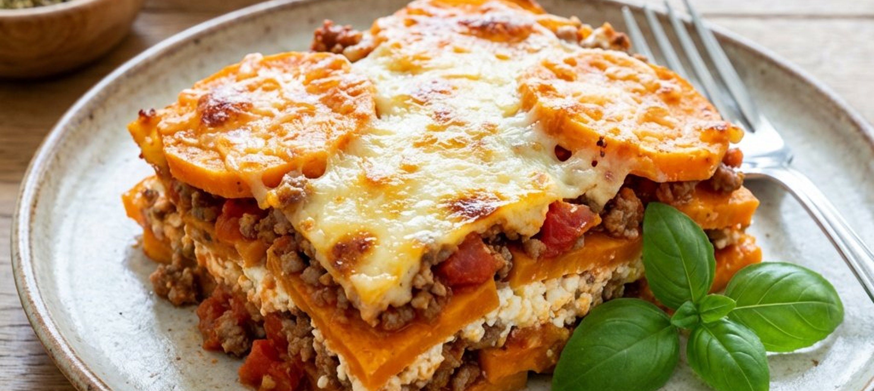 - 1Luați sosul de carne de pe foc și începeți asamblarea lasagnei: pe fundul tăvii pregătite, așezați jumătate din feliile de cartof dulce. Acoperiți cu jumătate din amestecul de carne, apoi întindeți jumătate din crema de brânză cottage. Repetați procesul cu restul ingredientelor (cartofi, carne, brânză). Introduceți tava în cuptor și coaceți timp de 45–50 minute la 180–185 °C.