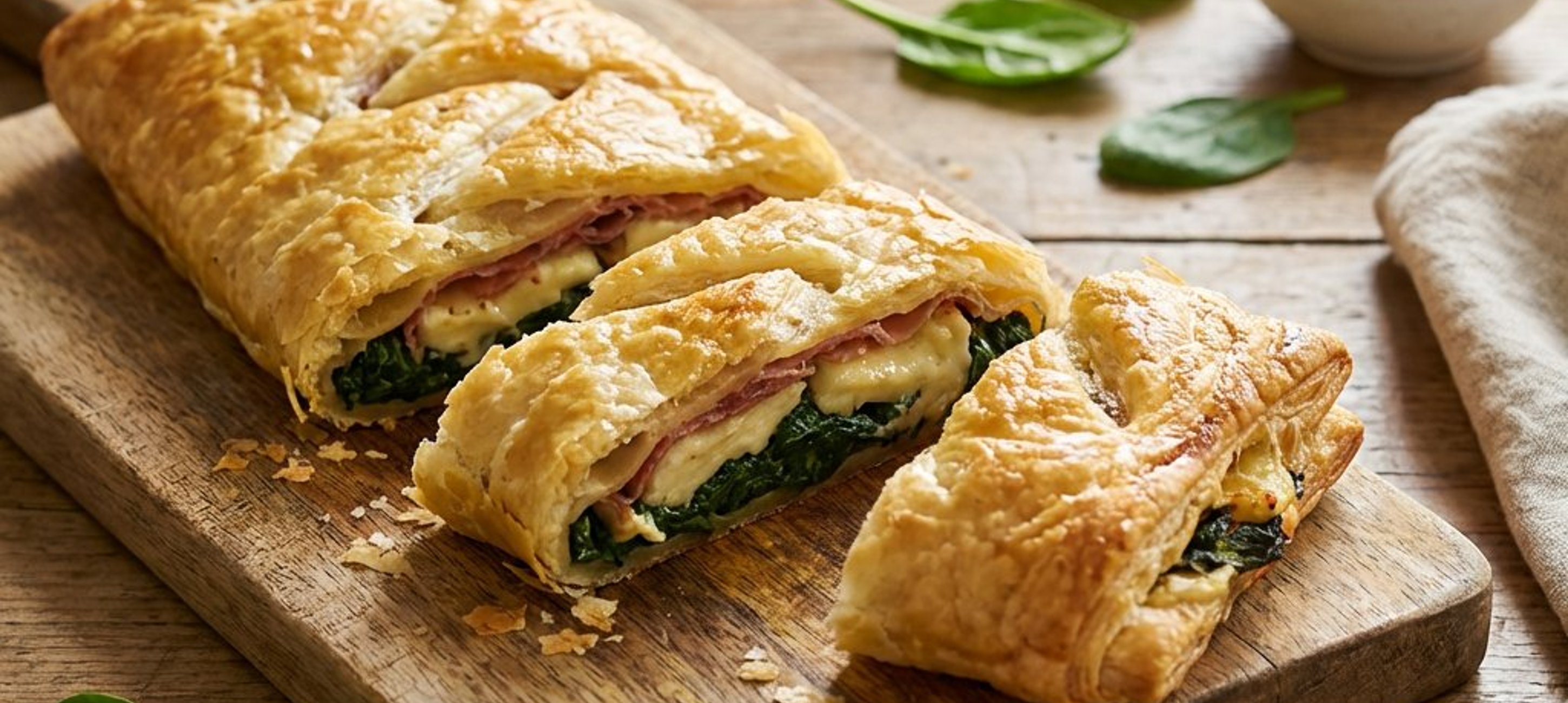 - 1Întindeți aluatul foietaj într-un dreptunghi (sau folosiți unul gata întins). Cu un tăietor de pizza, tăiați marginile laterale lungi în fâșii de aproximativ 2 cm lățime, la un unghi de 45 de grade. Lăsați o bandă centrală întreagă, de aproximativ 10 cm lățime. Pe această bandă centrală, așezați spanacul baby, apoi condimentați cu sare și piper alb.