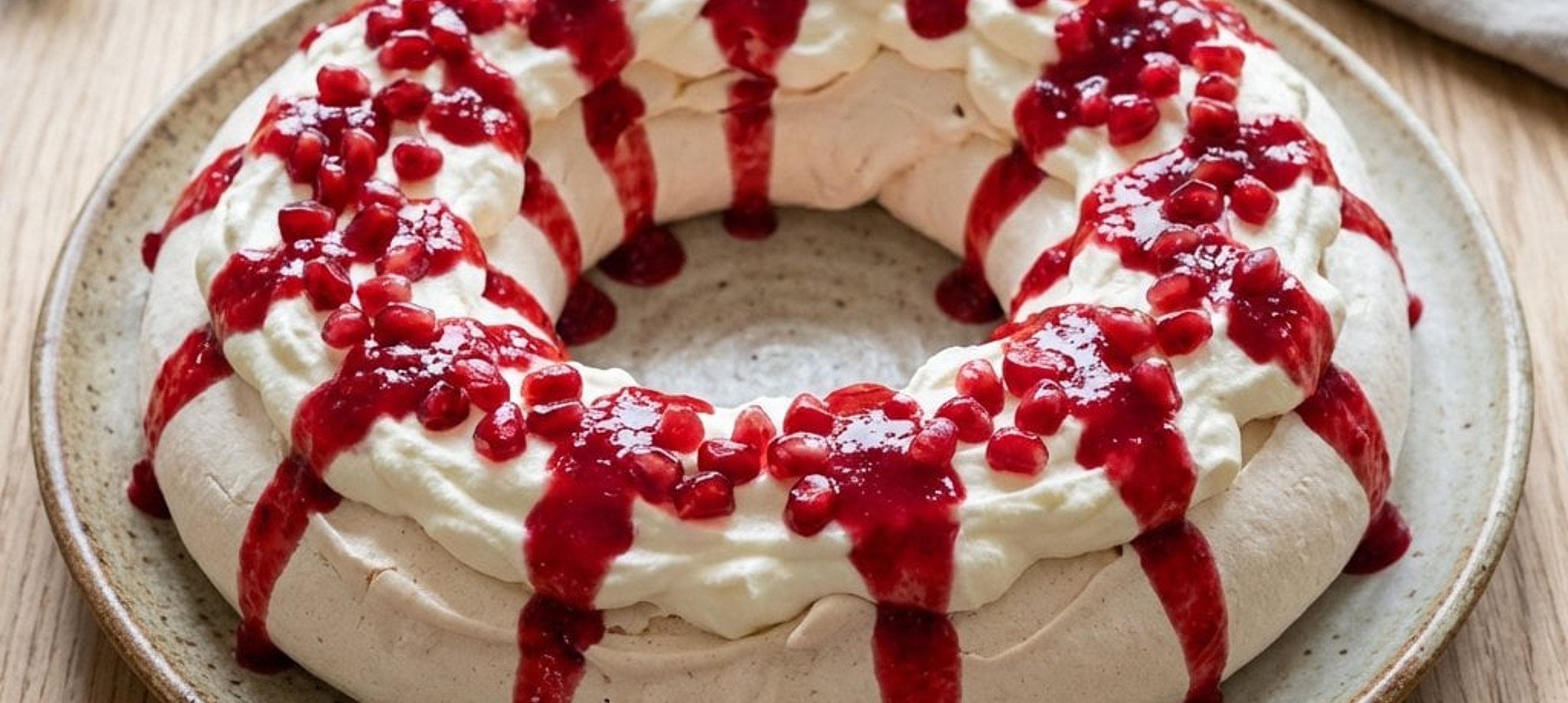 - 1Turnați sosul de zmeură peste coronița Pavlova și decorați cu semințe proaspete de rodie.