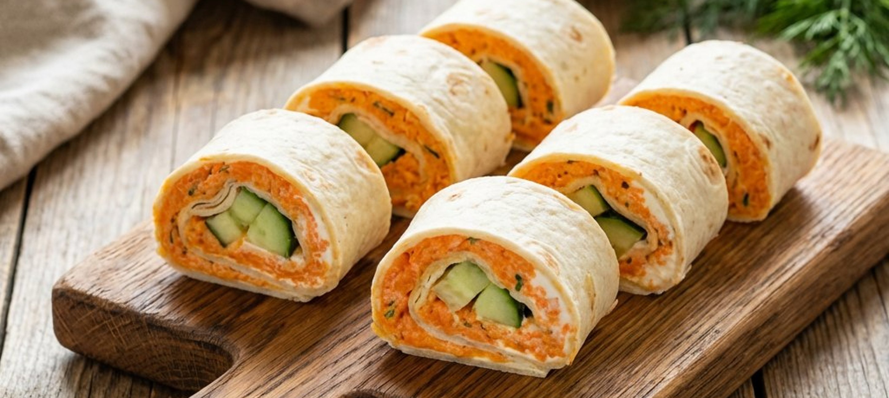 - 1Întindeți pasta de morcovi uniform pe cele două tortille, lăsând marginile libere pentru a putea rula ușor fără ca umplutura să iasă.