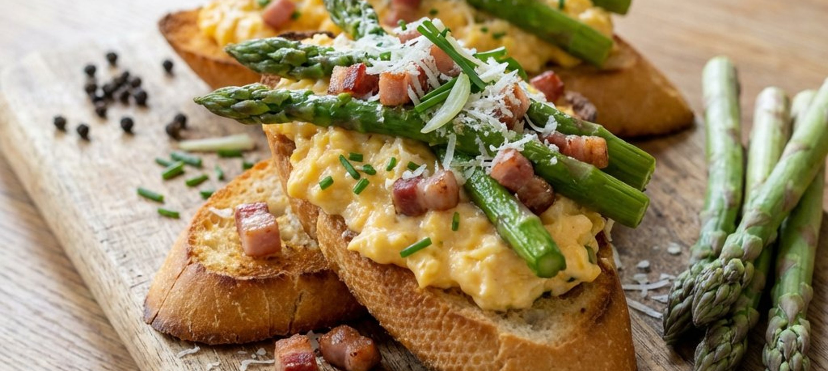 - 2Asamblați baghetele: pe fiecare felie crocantă puneți o porție generoasă de ouă jumări, adăugați cubulețele de pancetta prăjită și firele de sparanghel sotat.