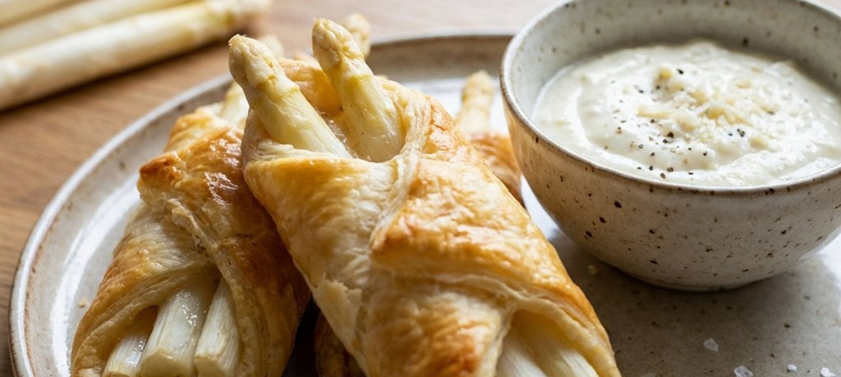 - 3Așază o tijă de sparanghel pe fiecare dreptunghi de aluat, astfel încât vârful să iasă puțin în afară. Unge o margine lungă a aluatului cu gălbenuș de ou. Îndoaie marginea scurtă de jos peste capătul sparanghelului, condimentează cu sare și piper, apoi rulează strâns. Repetă procesul pentru toate tijele și pune rulourile la congelator pentru 10 minute.
