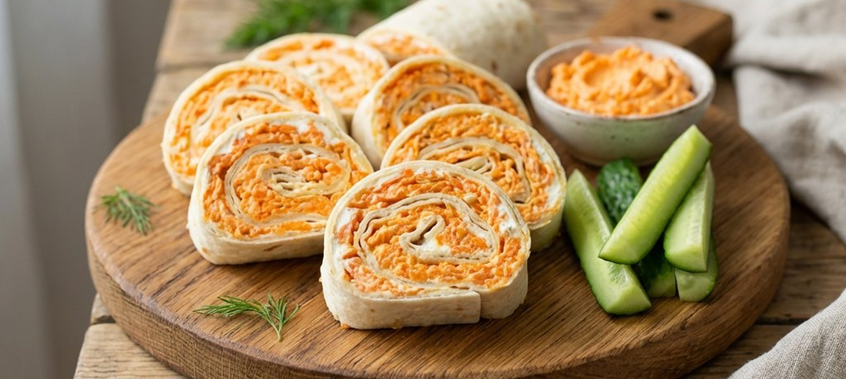 - 4Întindeți pasta de morcovi pe cele două tortille (nu până la margini, pentru a putea fi rulate ușor). Așezați fâșiile de castravete în mijloc și rulați strâns.