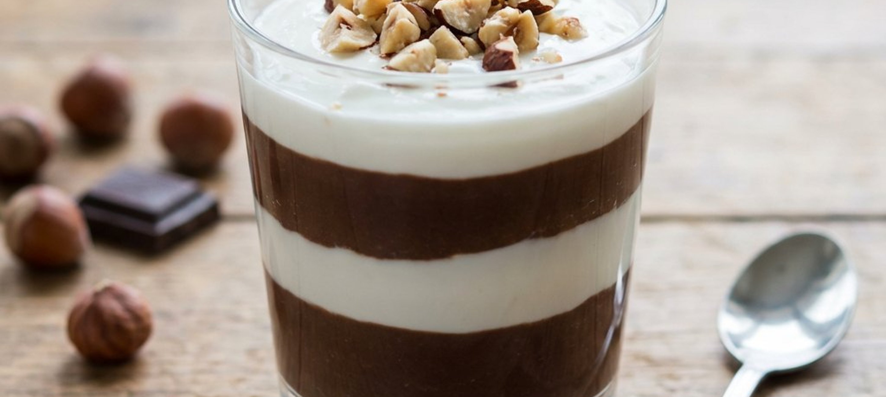 - 2Pregătiți 3 pahare și distribuiți cremele în 4 straturi alternative: începeți cu un strat de cremă de ciocolată și alune (folosind jumătate din cantitate), apoi un strat de cremă albă de smântână (jumătate din cantitate), urmat de restul de cremă de ciocolată și, la final, restul de cremă albă.