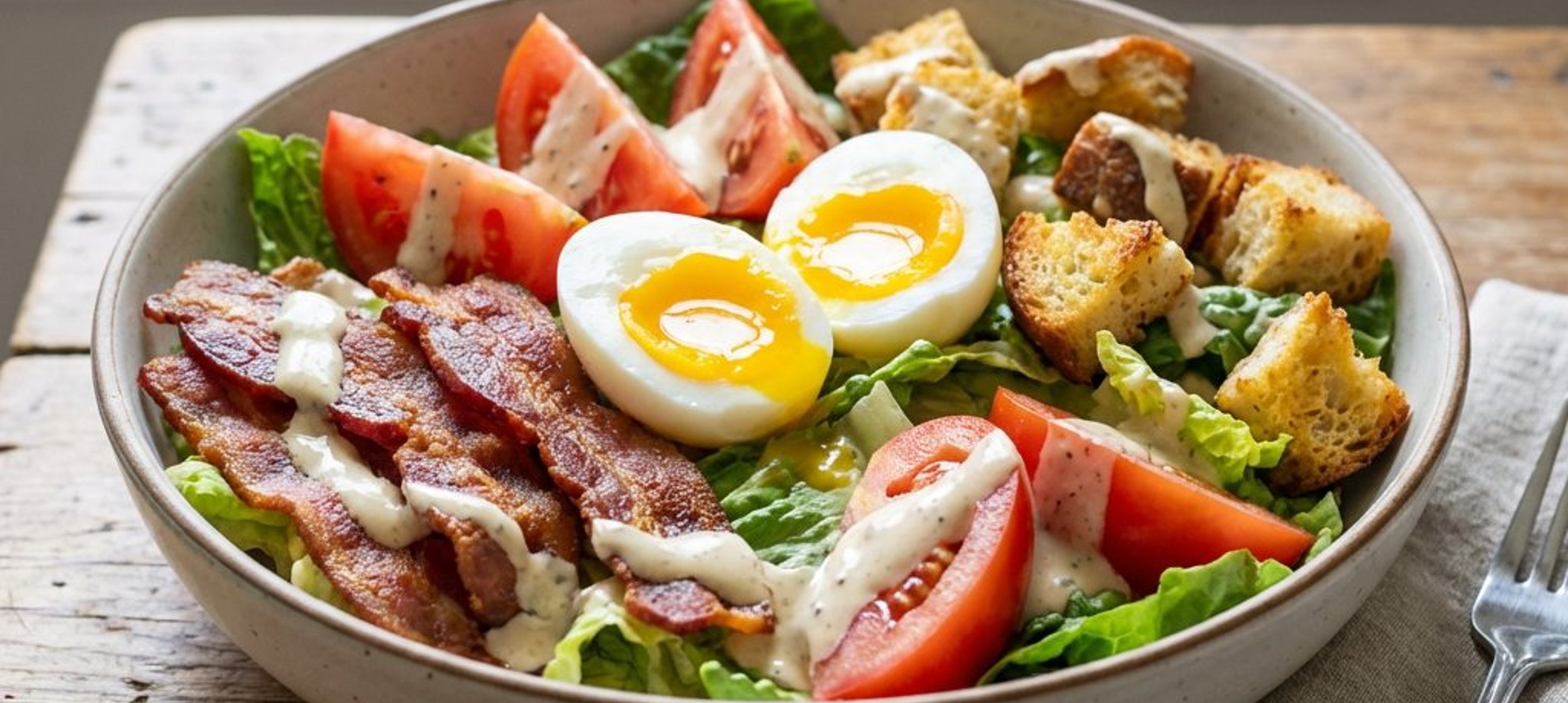 - 2Spălați și tăiați salata romană și roșiile. Într-un bol mic, amestecați maioneza cu sucul de lămâie pentru a obține dressingul. Într-un bol mare, combinați salata, roșiile, crutoanele și slănina ruptă bucățele. Adăugați dressingul, amestecați ușor și serviți cu jumătăți de ou fiert și arpagic verde tocat deasupra.