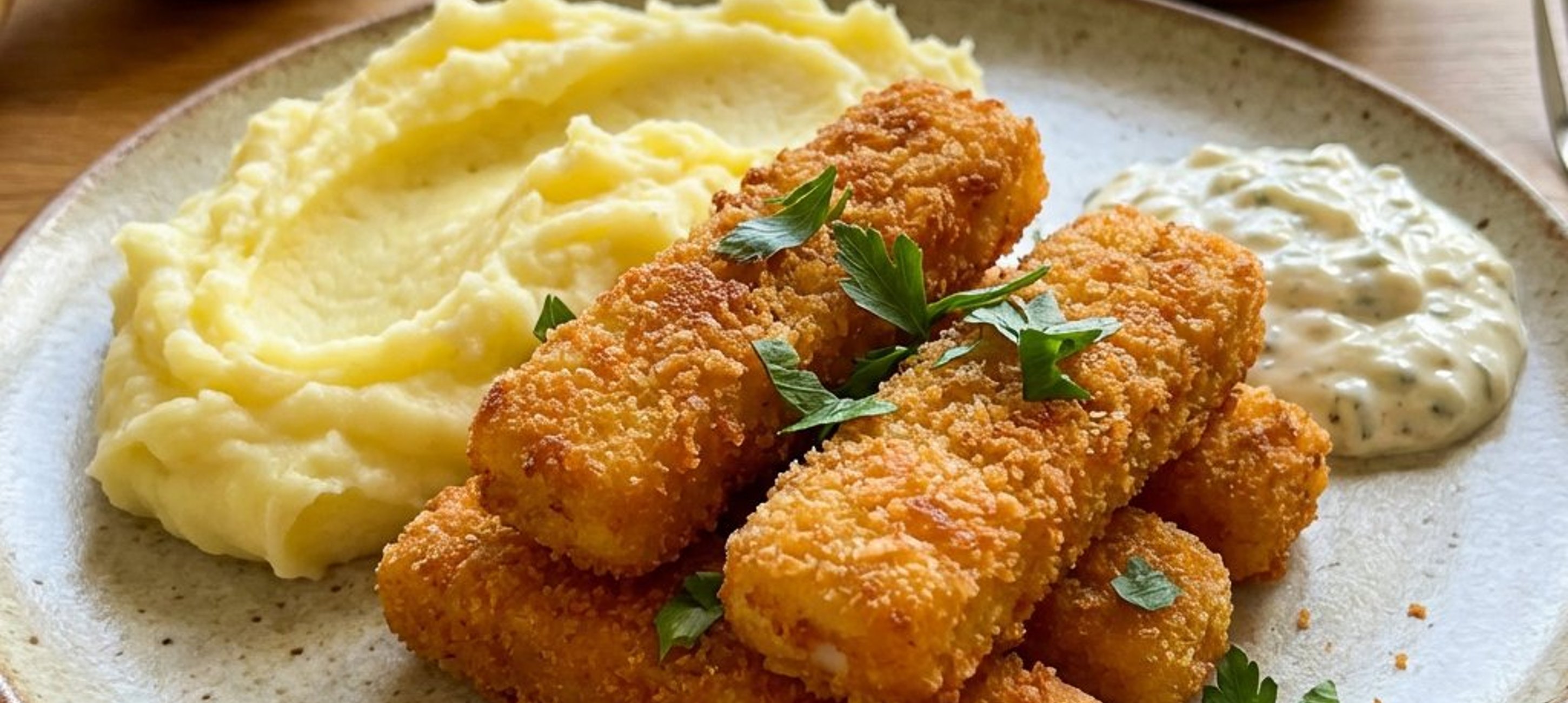 - 2Serviți degetele de pește calde alături de piureul de cartofi și o porție generoasă de sos tartar. Poftă bună!