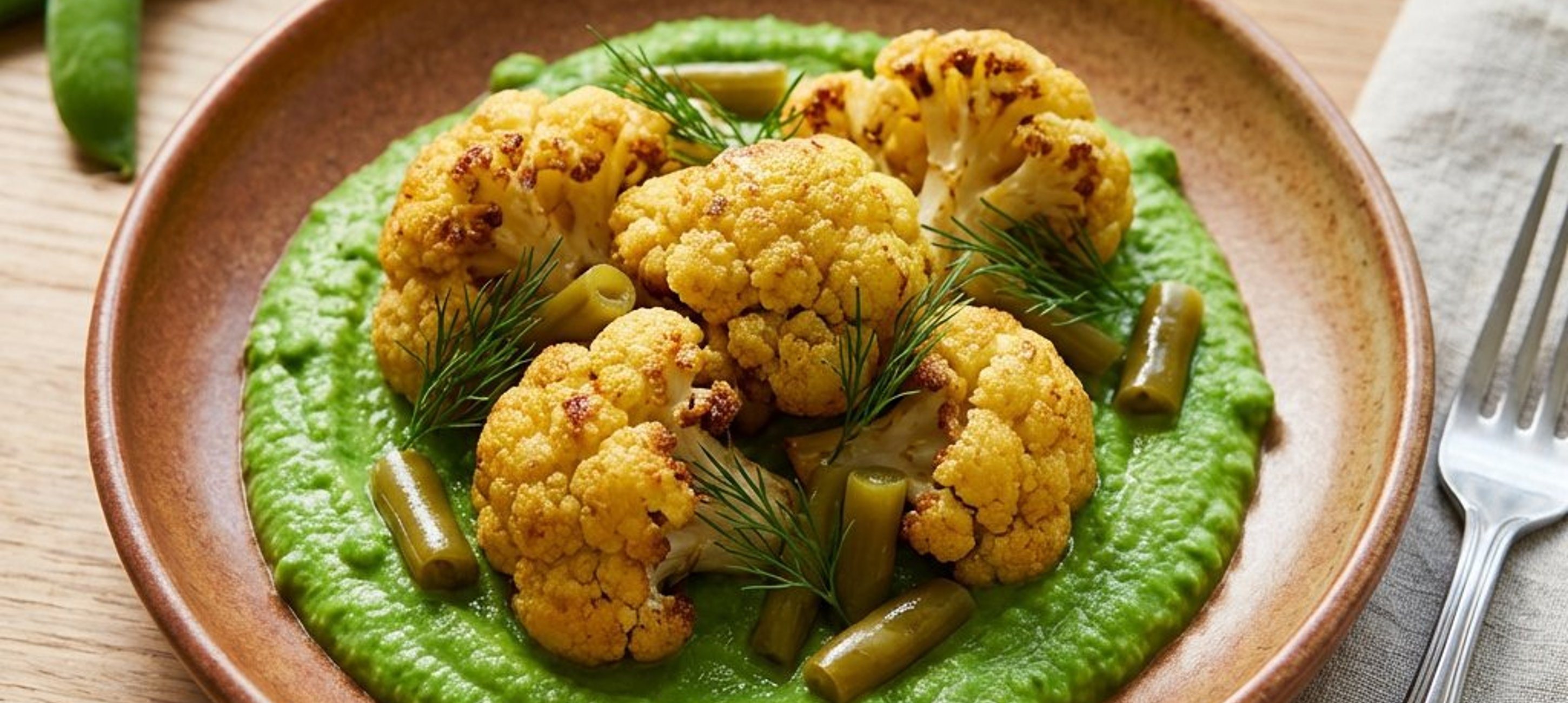 - 2Desfaceți conopida în buchețele individuale și așezați-le pe farfurie. Adăugați păstăile murate și decorați cu mărar proaspăt sau lăstari de mazăre.