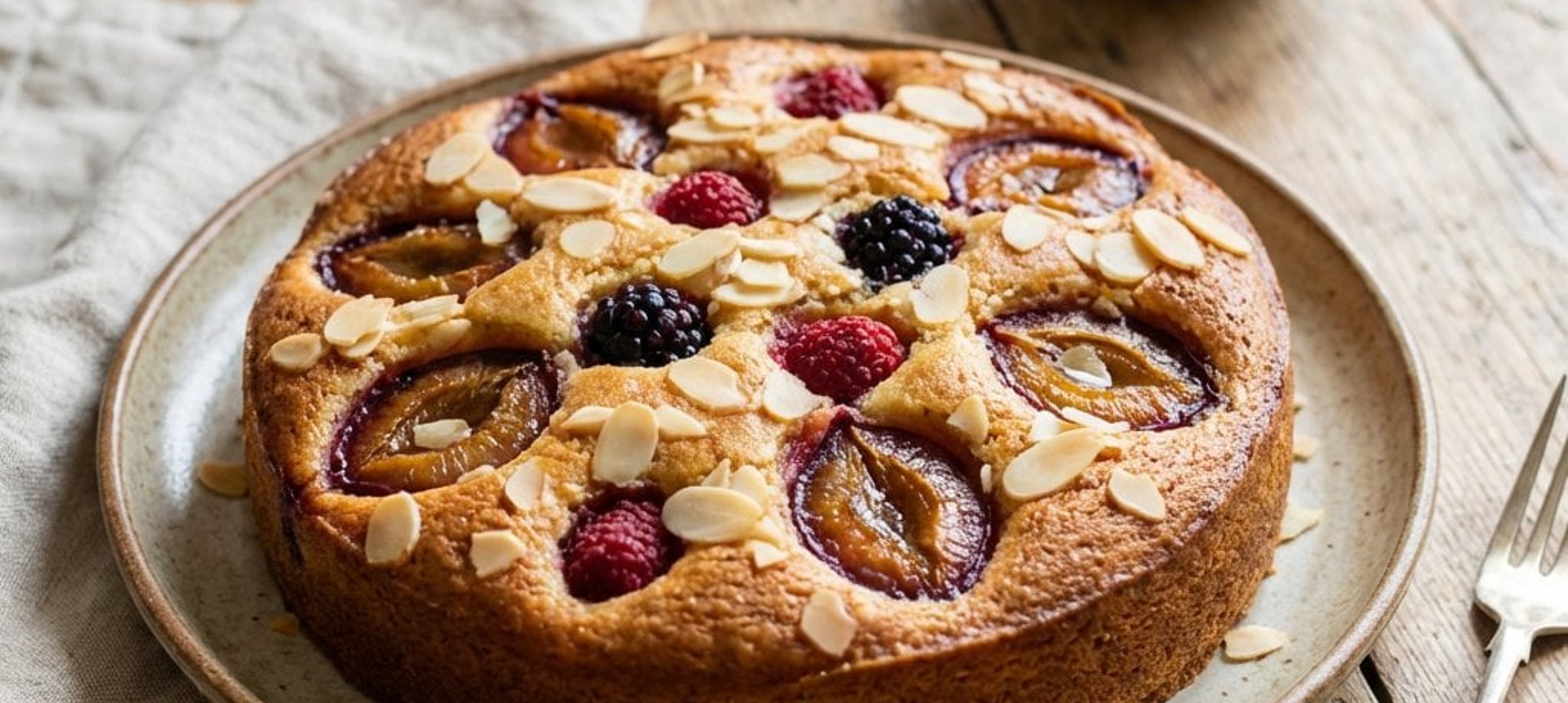- 3Turnați aluatul în forma pregătită și distribuiți uniform amestecul de fructe deasupra. Introduceți forma în cuptor și coaceți timp de 30–35 de minute la 170–180 °C.