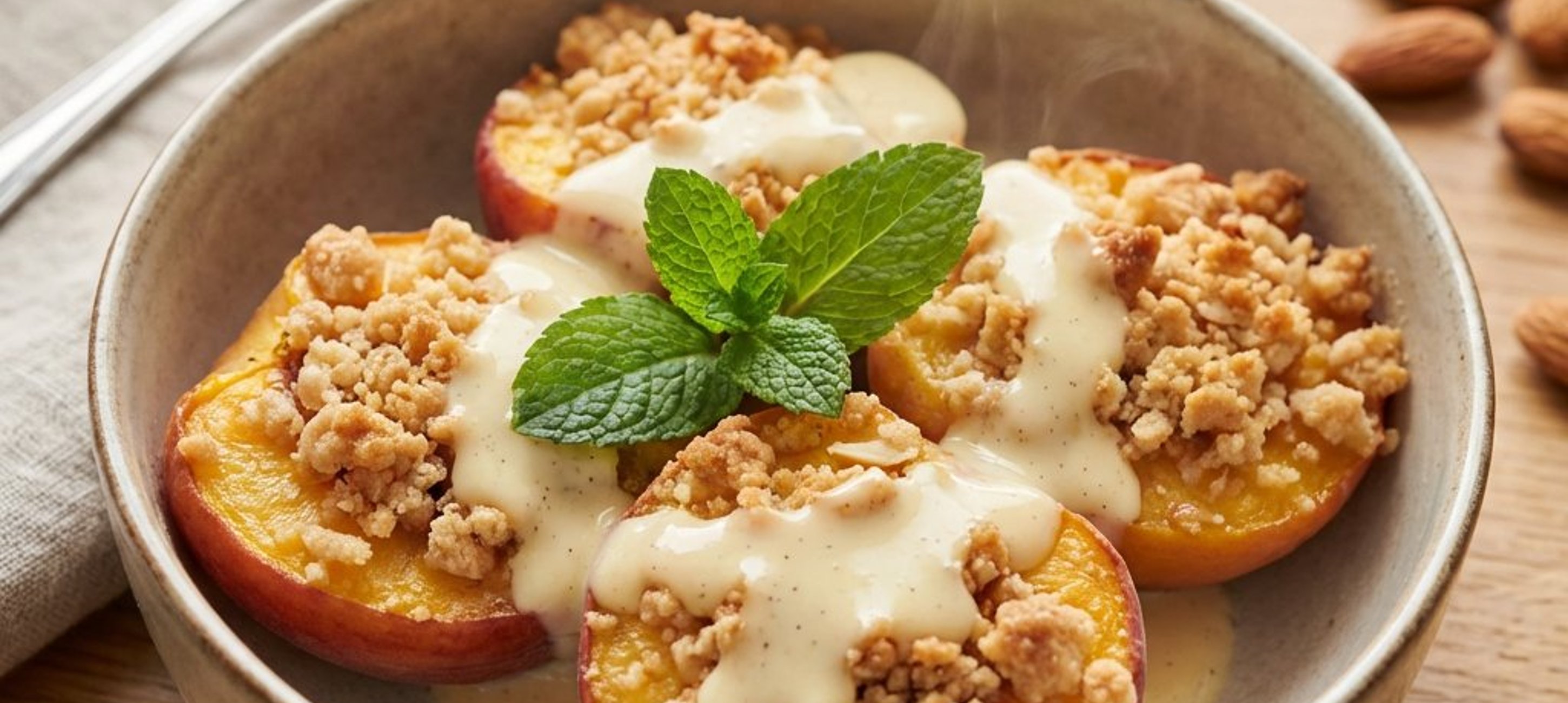- 2Distribuiți sosul de vanilie în 4 boluri. Așezați piersicile coapte deasupra sosului și decorați cu frunze de mentă proaspătă. Serviți imediat.